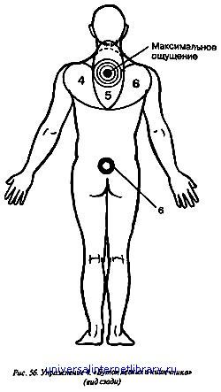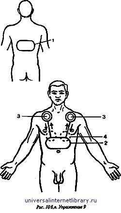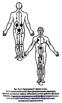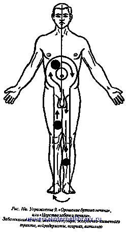 Упражнение 8. "Бутон почек" — при заболеваниях почек и мочевого пузыря, надпочечников, нервных заболеваниях и половых расстройствах (рис. 9). Начать лучше со спины. Такой проход ощущения называется "цепь для дикого льва" (дикий лев — мочевой пузырь). Через левую пятку поднимается Т по задней поверхности ноги — к копчику; здесь остановка на 3–4 сек. и усиление ощущений до максимума, при этом идем вглубь. Затем поднимаемся выше, движемся поверхностно вдоль и сбоку от позвоночника, как это показано на рис. 9а, делаем остановки в области почек и усиливаем здесь все ощущения до максимума, одновременно уходя вглубь. Затем вновь спускаемся до копчика, делаем одесь остановку и усиливаем ощущения до максимума, уходя вглубь; далее аналогично и симметрично опускаемся по правой ноге до стопы. Это один проход. Затем вновь переходим на левую стопу. Таких проходов можно сделать по 3 на каждое ощущение. Начинать можно с любой стопы, заканчивая в области мочевого пузыря. Продолжая упражнение, переходим на внутреннюю поверхность стопы, включая лишь большой палец; поднимаемся по передней и внутренней поверхности ноги, переходим на живот: далее делаем поверхностно оборот по кругу через соски и яремную ямку, как это показано на рис. 96, и спускаемся аналогично и симметрично — на противоположную сторону до стопы. Это один проход, оатем переходим на другую стопу и повторяем все еще раз. Таких проходов также надо сделать по 3 на каждое ощущение.