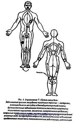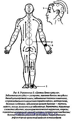 Таким образом повторить упражнения с каждым ощущением. Начинать можно с любой ноги. Упражнение 7. "Бутон желудка" — при заболеваниях желудка, щитовидной железы, расстройствах зрения, иммунной системы, обмена веществ (рис. 8). Основное упражнение (рис. 8 — вид спереди). Начинаем с передней поверхности правой или левой стопы, не захватывая большой палец; поднимаемся по наружной поверхности голени, далее по передней поверхности бедра до паха, переходим к центру, но немного не доходим до белой линии живота (идущей через пупок вертикально), поднимаемся вверх таким образом чуть выше пунка, далее через правый (или левый) сосок по дуге — к яремной ямке — и вверх, захватывая полость рта и носоглотку. Начинать можно и с носоглотки, затем спускаемся вниз аналогично и симметрично подъему — до левой стопы, где делаем небольшую остановку, затем возвращаемся тем же путем обратно до исходной позиции — правой стопы — это 1-й вариант; 2-й же вариант предусматривает переход из левой стопы сразу в правую стопу, и затем повтор всего прохода. Таких проходов следует повторить по два на каждое ощущение. При достаточно выраженных заболеваниях для усиления эффекта следует выполнить после описанного основного упражнения — еще одно (рис. 8 — вид сзади): начинаем с левой подколенной ямки, поднимаемся вверх по центру задней поверхности бедра, ягодицы — к центру спины (это место называется "седло"). Здесь делаем остановку, концентрируя и усиливая яркость ощущения, затем делаем интенсивный проход вперед-назад ("протирку") как бы насквозь, всего таких проходов делаем 3). После этого продолжаем поверхностно движение из «седла» по кругу, возвращаясь в это же место, далее спускаемся аналогично вниз по правой ноге до подколенной ямки, где делаем также небольшую остановку. Во время остановки в подколенных ямках делаем 3 прохода вперед-назад, как бы насквозь, после чего переходим вновь на левую подколенную ямку и повторяем такой проход еще раз (первый вариант) или возвращаемся тем же путем к исходной точке (второй вариант). Т. е. делаем 2 таких прохода. Начинать можно с любой подколенной ямки. И последнее. Выполняем после описанного упражнения также по 2 прохода по задней поверхности рук и спины, начиная и заканчивая их на нижней трети предплечий, как это показано на рис. 8 — вид сзади. При этом делаем остановки и усиливаем ощущение до максимальных в нижней трети предплечий.