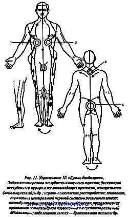 Упражнение 9. "Орошение бутона печени", или "Царство забот и печали" — при заболеваниях печени, желчного пузыря, желудочно-кишечного тракта, нейродермитах, псориазе, витилиго (рис. 10а, 106, 10в). Основное упражнение. Начинаем с внутренней поверхности правой стопы (захватывая лишь большой палец), поднимаемся вверх по середине передней и внутренней поверхности ноги, переходим на паховую область, затем к центру на живот, вращая ощущение по часовой стрелке, не захватывая центр живота, как это показано на рис. 10а, и затем аналогично и симметрично спускаемся по левой ноге до внутренней поверхности стопы. Это один проход. Затем переходим вновь на правую стопу (1-й вариант) или возвращаемся тем же путем (2-й вариант). Таких проходов делаем по 3 на каждом ощущении. При достаточно выраженных заболеваниях печени и желчного пузыря для усиления эффекта после описанного основного упражнения следует выполнить еще одно — "Ворота для света к дому печали" (рис. 106). Сзади на спине в области (1), которая также называется "Ворота для света к дому печали (в древности считали, что там остаются все печали, которые попадают в душу), концентрируем ощущение, добиваясь его яркости. Затем проходим вперед как бы насквозь — и назад ("протирка"), таких проходов делаем два. Затем из области (2) Спереди поднимаемся в подключичную область (3), делаем там небольшую остановку — и вниз, в область (4), затем снова повторяем это, т. е. делаем два прохода — с каждой стороны — справа, слева, каждый раз делая остановки в области (3). Упражнение 10. "Бутон двойняшек" — при заболеваниях печени, желчного пузыря и поджелудочной железы (рис. 11). Начинаем с наружной поверхности правой стопы, захватывая все пальцы, кроме большого, поднимаемся по наружной поверхности ноги назад к копчику (4), см. вид сзади, здесь усиливаем ощущение до максимума и идем вперед насквозь, переходя на переднюю поверхность в (1) — "Дом старой девы". Вот как об этом сказано в древнем Каноне: "Проходи в гости и согрей душевной теплотой дом старой девы. Если она держит за пазухой камень, сделай так, чтобы она выбросила его". Т. е. в (1) — остановка небольшая, максимальное усиление ощущения, затем переход (как показано на рис.) назад в (3) — "Дом отца", в нем остановка; далее переход через плечо на переднюю поверхность в (2) — "Дом трусливого обжоры"; в нем также — остановка и усиление ощущения до максимума; далее — вниз и назад, как бы насквозь в область копчика (4), где также усиление ощущения до максимума, проход вперед насквозь; затем переход на наружную поверхность левой ноги, опускаемся вниз до наружной поверхности левой стопы, не захватывая только большой палец. Это один проход. Далее переходим вновь на правую стопу и повторяем проход. Всего можно сделать по 2 прохода на каждом ощущении. По мере освоения этих упражнений (через 10–15 тренировок) проходы на каждое ощущение проводятся по одному разу.