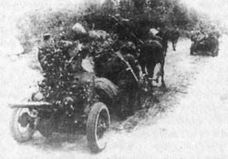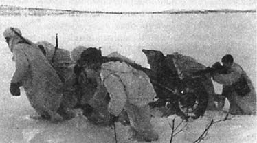 Расчет, впрягшись в лямки, сменяет позицию. Командир орудия (с биноклем) "висит" на стволе, чтобы уравновесить массу станин. Когда почувствовали, что вокруг стало стихать, развернули орудие и покатили его по улице. За спиной мы услышали шум танка - рев двигателя и клацанье гусениц. Кто-то крикнул: "Слышу шум мотора!" Справа, метрах в десяти, стоял сарай, но до него еще надо было добраться по слегка влажному снегу глубиной выше колена. Вспомнился фильм "Александр Невский" и врезавшаяся в память фраза: "Помирай, где стоишь". Я так и сказал. Слава богу, на меня никто не обратил внимание. Расчет подхватил орудие и покатил. Однако нижний щиток, расположенный между колесами, стал загребать снег, и через полтора метра толкать пушку вперед стало невозможно - она встала перед ею же образованным снежным валом. Матчасть я знал отлично, даром что работал в отделе технического контроля. У меня было личное клеймо номер 183, и на многих частях этого орудия стояло именно оно. Я говорю: "Стойте!" Нагнулся, снял защелку и поднял щиток. Пушка пошла, а я был реабилитирован за свою выходку. Мы подкатили ее к сараю, развернули в сторону танка, который не замедлил появиться. Чуть впереди нас стоял дом, к которому собирали раненых. Проходя мимо них, было слышно, как они шутили и смеялись - они уже отвоевались, знали, что скоро их отправят в тыл. Танк развернулся поперек дороги напротив этого дома и начал их расстреливать из пулемета. Я навел орудие, выстрелил. Снаряд пролетел сантиметров на пятнадцать выше башни. Позже, анализируя свой промах, я пришел к выводу, что, когда я стрелял по дому и фрицу с пулеметом, я установил прицел "на осколочный", а тут я стрелял бронебойным, у которого начальная скорость в два раза больше и траектория полета другая. Я не сообразил изменить прицел! После выстрела, так как сошняки были не подкопаны, пушка отскочила назад. Второй выстрел! Тоже мимо! Танк развернулся. Идет на нас. Стреляет из пулеметов, пули бьют по щиту. Выстрелил из пушки, но не точно - мы были в низинке, и снаряд пролетел выше. Меня же после второго выстрела, поскольку сошники не были подкопаны, левым колесом прижало к сараю. Пришлось переступить через станину и наводить орудие по стволу. В общем, только пятым снарядом с расстояния в десять метров я в него попал, и он загорелся. Я вскочил, руками машу, кричу: "Танк горит!!!" В это время из-за танка, выбежали немцы в белых халатах и рванулись в противоположную от нас сторону через дорогу, за дом, и оттуда начали поливать нас из автоматов. А поскольку нижний щиток был поднят, меня ранило в правую ступню, а заряжающего Толю Шумилова в колено. Командир орудия Дыдочкин, которого до этого я не видел, скомандовал: "Отходите во двор". Мы отошли во двор и вбежали в сарай. Двери в нем не было, и я сел у притолоки напротив дверного проема. За мной в сарай вбежал Шумилов, а бежавший за ним Голицын был убит автоматной очередью у самого порога. В дверной проем мне был виден стоявший метрах в тридцати круглый, сплетенный из ивовых прутьев курятник. Из-за него высунулся немец, начал что-то кричать. Я взял карабин у Толи Шумилова, поскольку мой остался на передке. И хотя я знал, что стрелять нельзя, чтобы не обозначить себя, но он так нагло кричал, что я не выдержал, прицелился и выстрелил. Немец клюнул носом. Второй, не соображая, подскочил к нему, подставив под мой вто