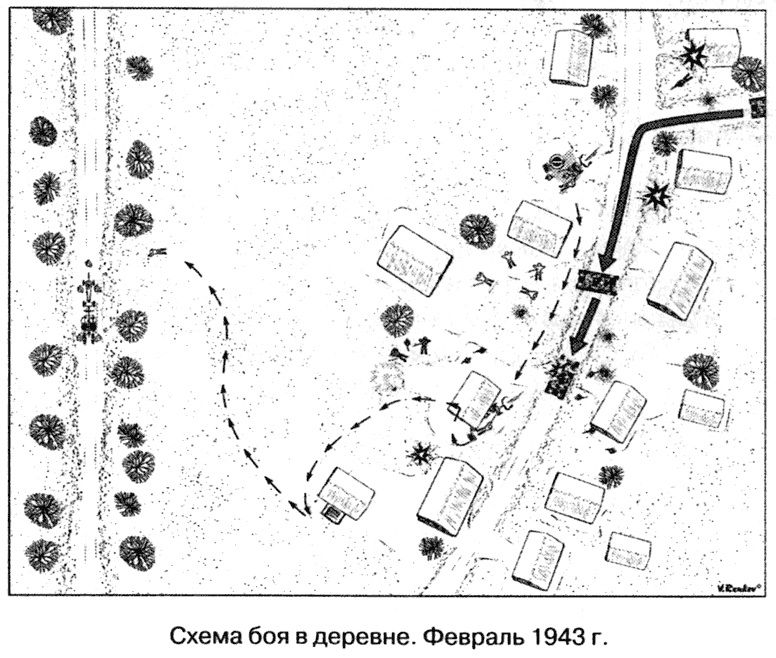 Схема боя в деревне. Февраль 1943 г. Я выглянул поверх щита. Горело несколько домов, отбрасывая на дорогу желтоватые блики. В свете пожаров я увидел впереди, метрах в двадцати пяти, немца в белом маскхалате, державшего в руках наперевес пулемет. Видимо, он поднялся осмотреться. Пока я наводил орудие, он уже опустился. Почему я долго наводил? Да потому, что при переходе на зимнюю смазку мы схалтурили и остатки летней смазки замерзли. Но я по тому месту, где он был, сделал два-три выстрела. В это время командир взвода Курбатов подал команду отходить. Как же так? Мы еще не навоевались, только чуть-чуть стрельнули, и отходить! Сидя схватились за станины, на попе ерзаем, а сдвинуть пушку не можем - ноги проскальзывают на льду. И тогда я выскочил за щит, на сторону немцев, и толкнул орудие, сдвинув его с наледи на утоптанный снег дороги. Пулеметная очередь, простучав по щиту, разбила коробку, в которую укладывался прицел (я еще выругался, ведь в ней был ключ от прицела), но меня не зацепила. Не дожидаясь, пока немцы еще раз откроют огонь, я нырнул за щит и вместе, сидя и упираясь ногами, мы смогли оттащить орудие.