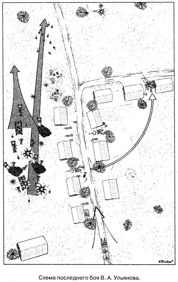 Схема последнего боя В. А. Ульянова. Следующий день выдался солнечным. Я сидел в беседке и спокойно писал наградные документы на всех своих солдат, сержантов, в том числе и на Фролова, которого представлял к званию "Герой Советского Союза". И вдруг в деревне начали рваться снаряды. Я стремглав бросился к орудию, которое стояло между домами. И опять, как вчера пехота, из нашего тыла мимо нас пошли бронетранспортеры. Сектор обстрела у меня был очень узкий, и я решил перекатить орудие, но не успели мы свести станины, как прибежал комбат: "Не трогай орудие! Не трогай орудие! Иначе они побегут!" Я вправо посмотрел, увидел жидкую цепь лежащих солдат, стрелявших в просвет между домами, и понял, что они лежат и стреляют только потому, что стоит орудие, и если я начну его перекатывать, то они решат, что я отступаю, и побегут. Вот так и пришлось мне вести огонь с этой неудобной позиции. Но я успевал. С бронетранспортером разговор короткий - ему в борт дал, и его песня спета. Два или три я сжег. За ними шел танк, и его я тоже подбил, все же основные силы немцев прорвались и, не ввязываясь в бой, ушли. Вскоре ко мне подбежал связной и сказал, что меня вызывает комбат. Я пошел к нему на НП, который располагался на окраине села в какой-то яме перед крайним домом. За этой ямой простиралось вспаханное поле, на краю которого виднелся немецкий дзот. Комбат говорит: "Видишь дзот?" - "Вижу". "Это наблюдательный пункт. Его надо заткнуть. Ты сможешь попасть в амбразуру?" - "Бронебойным попаду". - "Неважно каким, ты попади в амбразуру, чтобы они ослепли. Мы сейчас пойдем в атаку, и если они будут отсюда корректировать огонь своей артиллерии, они всех нас побьют". Я ушел за орудием, привел его и с третьего снаряда попал в амбразуру. Вернулся к комбату доложить, что его приказание выполнено. В этот момент за домом разорвался снаряд, а затем последовал взрыв впереди воронки, в которой мы сидели. Комбат у меня спрашивает: "Ну что, бог войны? Что происходит?" Я ему говорю: "Что происходит? Нас в вилку берут. Сейчас снаряды будут здесь". В это время, по-моему, два снаряда разрываются рядом с воронкой. Я сначала даже не почувствовал, что ранен в левую руку, левую и правую ноги. Комбату говорю: "Вот паразиты, сапоги порвали". - "А ноги?" - "Ноги целы. Я пойду к орудию". - "Это неважно, сынок, были бы ноги целы, сапоги найдем". Я поднялся, вылез из ямы и чувствую, что падаю. Прислонился к дереву, потом оттолкнулся и пошел. Я слышал, как комбат сказал: "Вот пошел мой герой". И последнее, что осталось в памяти, это окоп, в котором сидели два ездовых моего взвода. Я их попросил помочь мне добраться до орудия, но им совершенно не хотелось вылезать из окопа под непрекращающийся обстрел, и они отказались... Очнулся я в каком-то окопе, передо мной сидел солдат. Я у него спросил: "Где наши?" - "Все ушли вперед". - "А комбат?" - "Все пошли. Ты остался и еще несколько человек, раненых". Потом я читал, что в этом бою комбат и многие ребята погибли. Когда наступила ночь, за нами приехала повозка. Куда он нас повез, я не знаю, но вскоре мы услышали немецкую речь. Я зашипел на ездового: "Ты куда, гад, везешь?!" Мы развернулись и поехали обратно, а вскоре выехали к штабу полка. Нас остановили, спросили, кто едет. Я назвался и спросил, кто здесь старший. Мне ответили, что начальник штаба полка. Я попросил передать ему, чтобы он подошел. Он подходит: "Ну что? Заце