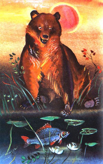 Часто виделись приятели, подолгу беседовали. Вот как-то раз пришел медведь на берег, а карась его уже ждет, на самом припеке плавает.