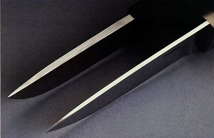 В какую сторону сместится «центр тяжести» этого компромисса, зависит от толщины клинка и соотношения между шириной плоской (верхней) части клинка и спуска. Чем шире спуск, тем острее угол образующего его клина, тем клинок лучше режет, но тем менее он прочный. Расширяя за счет спуска (при равной толщине и ширине клинка) плоскую его часть, сделаем клинок прочнее, но одновременно увеличим угол режущего клина, что неизбежно отрицательно скажется на режущих способностях. Сверху SOG Field Knife, внизу Fallkniven H1. Я специально постарался подчеркнуть освещением границу спуска.
