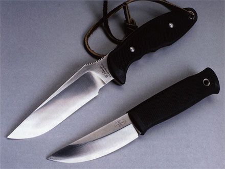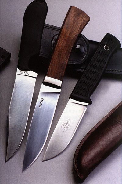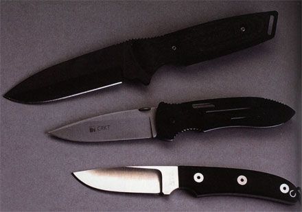 И опять же — все зависит от ширины спуска и радиуса кривизны образующей его поверхности. Полого вогнутый спуск под самый обушок обеспечивает отличные режущие свойства, но ослабляет клинок. Узкий крутой вогнутый спуск повышает прочность клинка, но ухудшает свойства, особенно при глубоких резах. Сверху вниз: KA-BAR Impact, CRKT Point Guard, охотничий нож швейцарского мастера-ножедела Ханса Петера Клоцли (Напс Peter Klotzli).