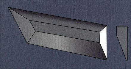 Плоский спуск и его движение в разрезаемом материале. Конечно, это только схема. В действительности ни один реальный нож не имеет клинка, показанного на верхнем рисунке. Он попросту был бы слишком непрочным даже для нормального резания, особенно в передней своей части, ближе к острию. Боковые поверхности, образующие спуск клинка реальных ножей, всегда немного выпуклые, позволяют сохранять разумную толщину клинка в меру приближения к острию, как это показано на нижнем рисунке.