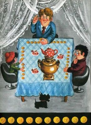"Стол находок утерянных чисел" - читать интересную книгу автора (Александрова Эмилия Борисовна, Левшин...)ЧАШКА ЧАЯ, ДЕСЯТЬ ФИШЕКМы вышли из Стола находок и остановились в нерешительности. Куда идти? Если бы речь шла о пропавшем слоне, всё было бы ясно. На слоновьи ассоциации следует охотиться в Африке. Или в Индии. Или, на худой конец, в местном зоопарке. Другое дело — ассоциации числовые. Они могут возникнуть где угодно, по той простой причине, что числа — всюду. Вот улица. У неё две стороны. На обеих — дома. Все они пронумерованы. На одной стороне — номера чётные, на другой — нечётные. И что это, если не числа? Или другой пример: дом. Стар он или нов, мал или велик, низок или высок — в любом случае у него есть окна, двери, лестницы, ступеньки и, уж конечно, не меньше одного этажа. Всё это опять-таки легко пересчитать. То же самое можно сказать о любом без исключения предмете. Или растении. Или живом существе. Даже таком крохотном, как Пуся, у которого есть короткие лапы, хвост, чудесные уши с кисточками, мокрый холодный нос, любопытные пуговки-глаза, свежий розовый язык, острые белые зубки и, наконец, чёрная лохматая шёрстка, состоящая из шелковистых волосков. Сосчитать их, правда, вряд ли удастся — разве что электронно-вычислительной машиной… Да, прав был великий математик Лобачевский! Поистине, нет ничего на свете, чего нельзя было бы выразить числами. И раз числовые ассоциации могут возникнуть всюду, почему бы нам не отправиться в парк? По крайней мере, совместим приятное с полезным… Но в том то и дело, что парка в Энэмске нет. Почему? Да потому, что весь он от начала до конца — чудесный громадный парк. Сами понимаете, что выбор маршрута в таких условиях — дело нелёгкое, и мы тотчас заспорили. Положение сложилось почти такое, как в известной басне Ивана Андреевича Крылова, где лебедь рвётся в облака, рак пятится назад, а щука тянет в воду. С той разницей, что в нашей компании был и щенок. Он-то и решил исход дела! Солнце, зелень, промытый дождём воздух — всё это привело его в восторг, и, не обращая на нас ни малейшего внимания, он помчался вперёд, оглашая улицу радостным тявканьем. Мы, естественно, помчались за ним и вскоре очутились у небольшого уютного павильона с заманчивой вывеской: «Чашка чая, десять фишек». Тут Пуся остановился как вкопанный, а девочка, наоборот, нетерпеливо заплясала на месте и заявила, что ей страсть как хочется чаю с печеньем. Пришлось объяснить, что фишки — не печенье, а жетончики с цифрами и что в павильоне, но-видимому, играют в какую-то числовую игру. — Вот и прекрасно, — обрадовалась она. — Мы с Пусей будем пить чай, вы (это она мне!) — играть в числовую игру, а Главный терятель — подстерегать ассоциации. — Благодарю вас, — иронически расшаркался Главный терятель, — очень, очень вам признателен. Как я и предполагал, в павильоне действительно играли в числовую игру, и даже не в одну, а во многие. Хотя все они, так или иначе, были связаны с девятью цифрами десятичной системы счисления — той самой, которой мы с вами пользуемся. Но не ошиблась и девочка, когда думала, что фишки — это печенье. Здешние фишки и впрямь выпекают в кондитерской. Все они круглые, ароматные, румяные, только вместо рисунка на них цифры. По одной на каждой. Раздают их при входе в целлофановых пакетиках. В каждом пакетике набор из десяти сдобных кругляшек с цифра