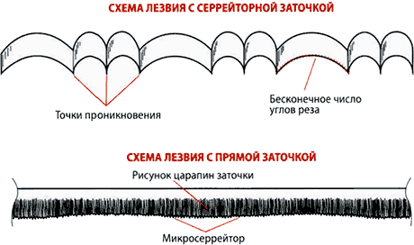 ""Зубы" в твоем кармане" - читать интересную книгу автора (Прорез Журнал, Федосов Антон)СЕРРЕЙТОР И ГЛАДКОЕ ЛЕЗВИЕВ чем же принципиальное отличие реза, производимого серрейторным клинком? Для примера возьмем тонкую ветку и перережем ее сначала гладким лезвием. Ровная кромка режет ветку по одной грани, перепиливая дерево своими карбидами, то есть частичками углерода, реже — кобальта, находящимися на режущей кромке, углубляясь в него под воздействием хода и подачи ножа. При перепиливании ветки серрейтором также используются ход и подача, но ход в этом случае получается более эффективным. Не углубляясь в физику и геометрию, отметим, что разные элементы серрейтора находятся по отношению к ветке под разными углами и на разной высоте и практически одновременно воздействуют на разрезаемую древесину в нескольких местах, разрушая ее в разных направлениях. Поэтому последовательных движений серрейтора и затрат усилий потребуется меньше.