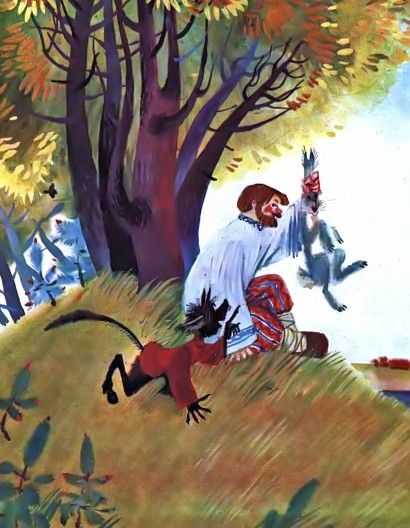 Держит Балда за уши одного зайку:«Попляши-тка ты под нашу балалайку;Ты, бесенок, еще молоденек,Со мною тягаться слабенек;Это было б лишь времени трата.Обгони-ка сперва моего брата.Раз, два, три! догоняй-ка».Пустились бесенок и зайка:Бесенок по берегу морскому,А зайка в лесок до дому.Вот, море кругом обежавши,Высунув язык, мордку поднявши,Прибежал бесенок задыхаясь,Весь мокрешенек, лапкой утираясь,Мысля: дело с Балдою сладит.Глядь — а Балда братца гладит,Приговаривая: «Братец мой любимый,Устал, бедняжка! отдохни, родимый».