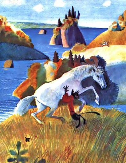 А Балда над морем опять шумитДа чертям веревкой грозит.Вылез опять бесенок: «Что ты хлопочешь?Будет тебе оброк, коли захочешь…»— «Нет, — говорит Балда, —Теперь моя череда,Условия сам назначу,Задам тебе, враженок, задачу.Посмотрим, какова у тебе сила.Видишь: там сивая кобыла?Кобылу подыми-тка ты,Да неси ее полверсты;Снесешь кобылу, оброк уж твой;Не снесешь кобылы, ан будет он мой».Бедненький бесПод кобылу подлез,Понатужился,Понапружился,Приподнял кобылу, два шага шагнул.На третьем упал, ножки протянул.А Балда ему: «Глупый ты бес,Куда ж ты за нами полез?И руками-то снести не смог,А я, смотри, снесу промеж ног».Сел Балда на кобылку верхомДа версту проскакал, так что пыль столбом.Испугался бесенок и к дедуПошел рассказывать про такую победу.Черти стали в кружок,Делать нечего — собрали полный оброкДа на Балду взвалили мешок.Идет Балда, покрякивает,А поп, завидя Балду, вскакивает,За попадью прячется,Со страху корячится.Балда его тут отыскал,Отдал оброк, платы требовать стал.Бедный попПодставил лоб:С первого щелкаПрыгнул поп до потолка;Со второго щелкаЛишился поп языка,А с третьего щелкаВышибло ум у старика.А Балда приговаривал с укоризной:«Не гонялся бы ты, поп, за дешевизной».