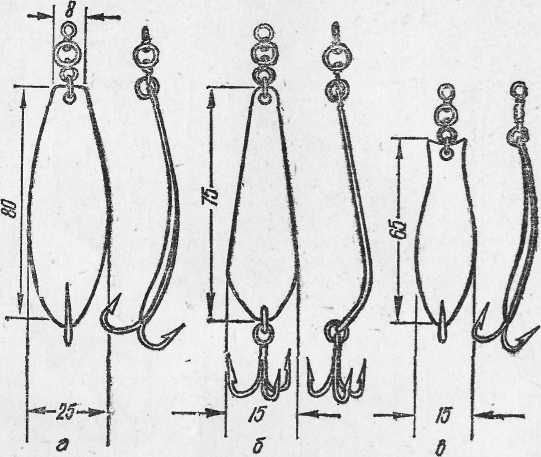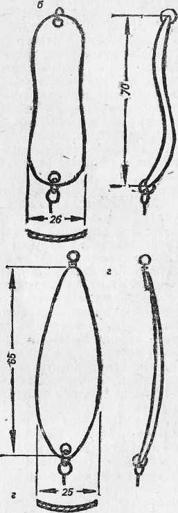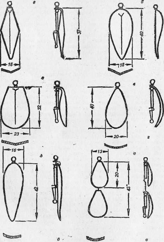 Рис. 18. Колеблющиеся блесны: Колеблющиеся блесны, имеющие массу от 12 до 40 г, обеспечивают заброс без дополнительного груза, что исключает захлестывание блесны за лесу. Блесны типа «уральская», «норич», «шторлек» массой 12–15 г и толщиной 1,5–2 мм позволяют осуществлять проводку их в самом верхнем слое воды, если начать обратную подмотку лесы сразу же после падения блесны в воду. Это дает возможность успешно ловить рыбу на мелководье, над корягами, над водорослями, поднявшимися высоко от дна. Колеблющиеся блесны применяются и в тиховодье, и на сильном течении. Большая масса приманки и отсутствие груза облегчает заброс и увеличивает его дальность. Тяжелые колеблющиеся блесны массой 20–40 г и толщиной 2,5 мм на тиховодье дают хороший результат только при быстрой проводке на глубине 1–2 м. Для ловли на большей глубине в водохранилищах, где нет течения, используют самые легкие колеблющиеся блесны толщиной 0,7–0,8 мм со спиннинговым грузилом. В ясную солнечную погоду более уловисты блесны из желтой и красной меди, в пасмурную — белого цвета. На выбор цвета блесны влияет также степень прозрачности воды.