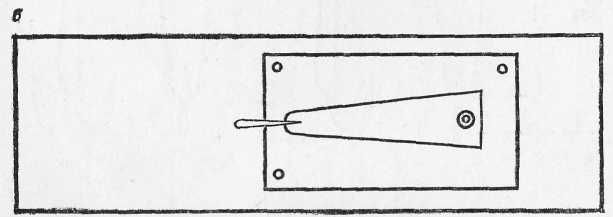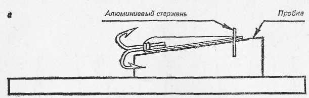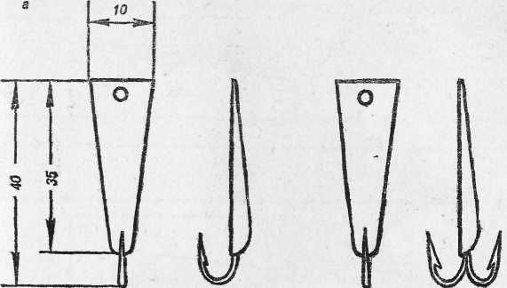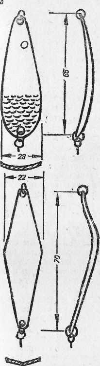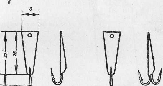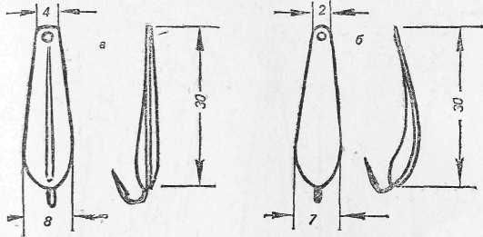 Рис. 20. Крупные зимние блесны: а — «щучья»; б — «власовская»; Для ловли щуки используют крупные зимние блесны (рис. 20). Посеребренные и ярко начищенные, они применяются при ловле рыбы утром и в пасмурную погоду, потускневшие и темные, — в солнечную погоду. Кроме указанных выше зимних блесен, для ловли окуня можно успешно использовать и самодельные. Например, блесной, предложенной рыболовом-любителем Н. Е. Трошевым, ловить окуней можно отвесным блеснением и по перволедью, в середине и в конце зимы, вблизи от берега и на глубине (рис. 21). Положительное качество этой блесны состоит в том, что при погружении в воду она скачкообразно уходит в сторону, переваливаясь с боку на бок, имитируя этим игру мелкой рыбки. Эта блесна делается с одним или двумя крючками на специальном приспособлении для пайки (рис. 22). Приспособление состоит из дощечки, пробки и алюминиевого стержня. Из пробки вырезают брусок длиной 4,5–5, шириной 2,5 и высотой 1,5 см. Верхнюю часть пробки срезают наискось под углом 2–3° так, чтобы при пайке верхняя кромка олова, залив цевье крючка, была параллельна поверхности дощечки. После этого пробку по углам крепят мелкими гвоздями к дощечке длиной 10 и шириной 5 см.