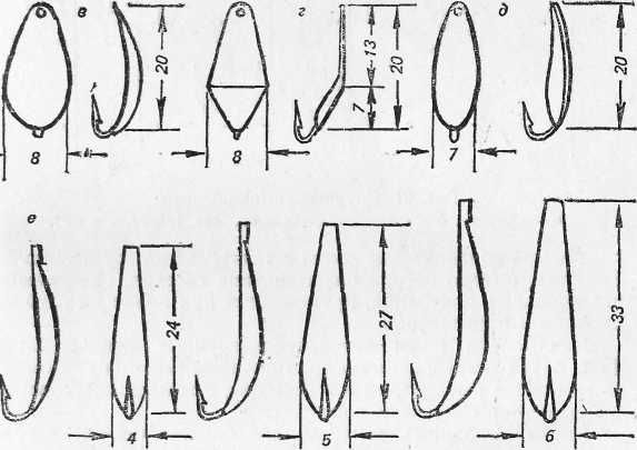 Рис. 19. Мелкие зимние блесны: Мелкие блесны длиной до 30–35 мм используют обычно для ловли окуня. Лучшими мелкими блеснами являются «удача», «успех», «карасик», «ромбик», «малек», «гвоздик» (рис. 1). Легкие мелкие блесны, изготовленные из пластинки металла, больше подходят для ловли в тиховодье на глубине до 3 м. Тяжелые, быстро погружающиеся типа гвоздик, не дающие значительных колебаний, применяются при ловле на глубинах свыше 3 м и на течении.