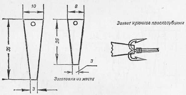 Рис. 21. Блесна Грошева: Блесна изготавливается следующим образом. Из консервной банки ножницами вырезают заготовку (рис. 22). В широкой ее части шилом прокалывают отверстие и зачищают от заусениц, затем вырезанную заготовку лудят с обеих сторон. При изготовлении блесны с двумя крючками цевье крючков зажимают плоскогубцами, обматывают несколькими оборотами проволоки толщиной менее 0,1 мм и лудят. Жестяную заготовку кладут на пробку приспособления для пайки блесны и крепят алюминиевым стержнем к пробке. Спаянные крючки вкалывают в пробку так, как показано на рис. 23, и цевье их кладут на нижний узкий край заготовки. На заготовку в верхней ее части кладут кусочек олова, расплавляют его прикосновением паяльника и заливают цевье крючка. После того как олово затвердеет и остынет, вынимают алюминиевый стержень и снимают блесну. Нижнюю часть блесны на 2–3 мм и часть затылка крючков красят красной краской (обычно используют масляную краску «Кадмий красный светлый»). Можно вместо окраски надеть на затылок крючка кусочек изоляции от монтажного провода красного или рубинового цвета.