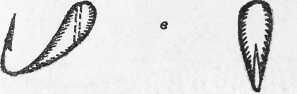 Рис. 23. Мормышки: Мормышки. Мормышка — это небольшой грузик с впаянным в него некрупным, но прочным крючком и сквозным отверстием для крепления к лесе. Мормышки делают литыми из свинца, олова, припоя или изготавливают их корпус из меди, латуни, серебра и заполняют его припоем, одновременно впаивая крючок. Формы мормышек разнообразны (рис. 23). Наиболее ходовые мормышки «дробинка», «овсинка», «уральская». Уловистость мормышек зависит от цвета и особенно от величины и массы, от качества, остроты и правильной постановки крючка. Крючок должен выступать так, чтобы жало его не находило на тело мормышки и было отогнуто вверх от стержня крючка на 5–7°. По массе мормышки подбираются с учетом толщины лески. Лучшей является мормышка минимальных размеров, которая своей массой может вытянуть в воде леску в прямую линию и согнуть кивок на 25–30°, что позволит с помощью кивка передать приманке необходимые колебания и заметить даже самую осторожную поклевку. Зимой при ловле окуня, плотвы, леща лучших результатов достигают, используя самые мелкие мормышки (например, «дробинки» №№ 3–4). Средние и крупные мормышки обычно применяют летом. Снасточки. При ловле хищной рыбы спиннингом и на дорожку в качестве приманки используют мертвую рыбку, насаживаемую на снасточку.