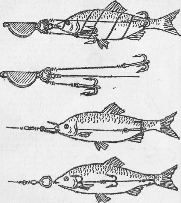 Рис. 24. Снасточки для ловли на мертвую рыбку. Снасточка представляет собой приспособление с несколькими крючками на поводках из сталистой проволоки, предназначенное для насадки мертвой рыбки. Варианты конструкций снасточки показаны на рис. 24. Они оснащены: первая — стержнем из мягкой проволоки для ввода в тело рыбки через рот и двумя тройниками на поводках; вторая — тройником и одинарным крючком на одном поводке; третья — тремя небольшими тройниками на одном поводке. Для сохранения цельности рыбки на снасточке тело ее может обматываться медной проволокой толщиной 0,2–0,3 мм спиральными витками от головы до хвоста. Мертвую рыбку на снасточке в качестве приманки применяют при плохом клеве на блесны, в тех случаях, когда для облова участка водоема необходим медленный темп проводки. Для насадки на снасточку обычно используют узких рыбок, которые естественнее играют при проводке, да и хищники предпочитают их широким. |