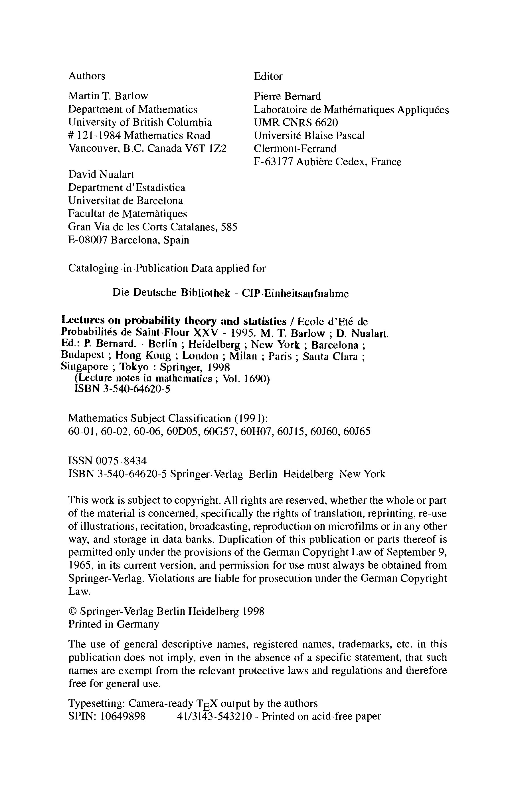 "Lectures on probability theory and statistics" - читать интересную книгу автора (Martin T. Barlow, David Nualart, Pierre Bernard)