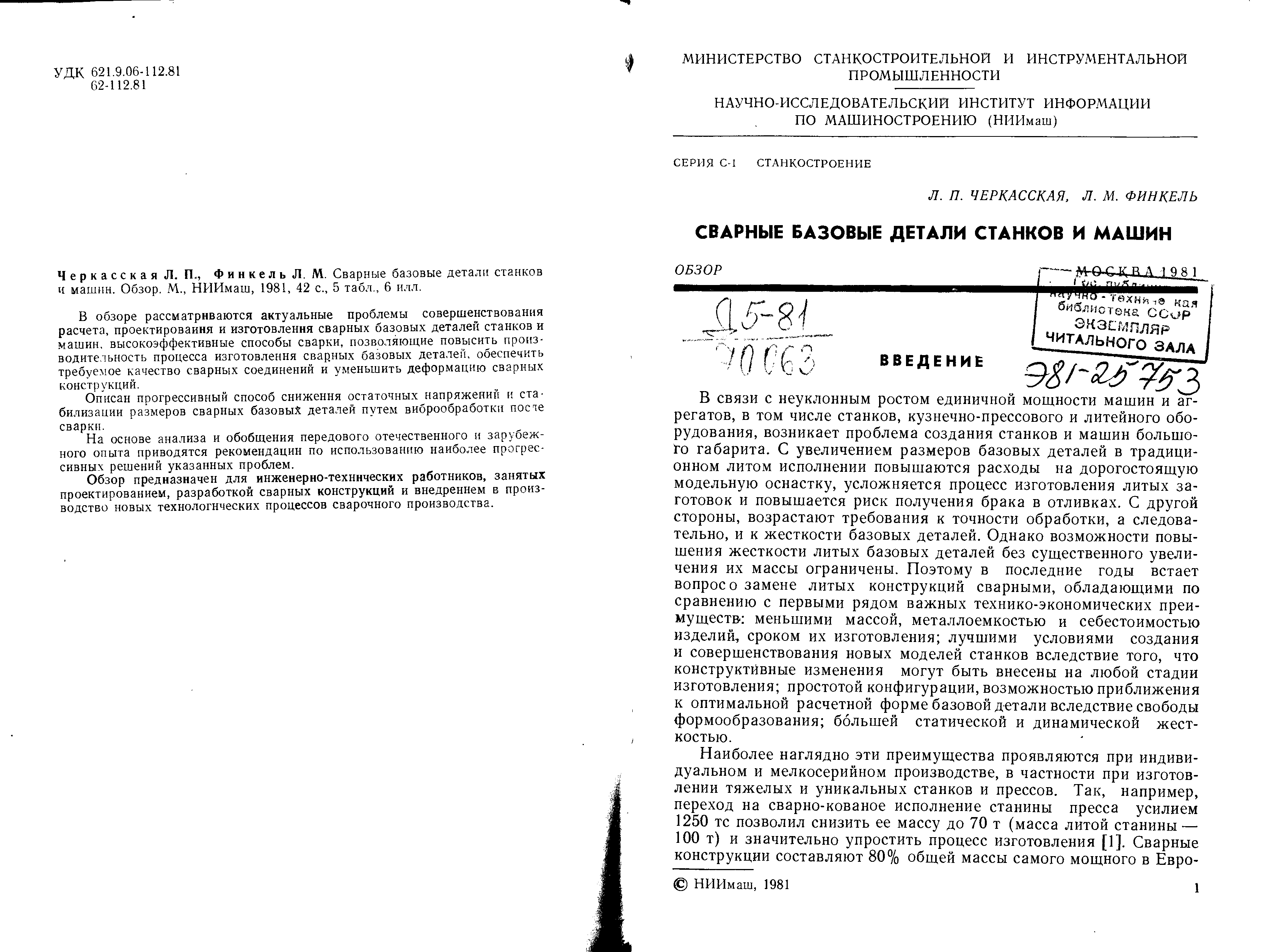 "Сварные базовые детали станков и машин. Обзор" - читать интересную книгу автора (Авторы: Л.П.Черкасская, Л.М.Финкель.)