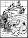 "You mean you let her go?" The auntie threw up her hands. "You must be stupid." "Never mind, Auntie," sighed Tora. "Tell me about this girl Omaki. Is she here?" "That one? You can forget her! She's taken. And I've washed my hands of her. Took her on because the professor asked me to, but she's unreliable. Always looking to catch a man." "What do you mean, she's taken?" "Never you mind! She's not here and I'm busy and don't have time for silly fools. Go away!" Outside the lanterns glimmered in the scented darkness like fireflies among the trailing willows. Revellers crowded the streets in holiday garb and lovers embraced in the shadow of the trees. Tora spent an hour strolling about, smiling at the few unaccompanied girls. None proved free and easy company. His spirits low, he finally leaned against one of the willow trees and pondered what he should do. It was too early to go home. He had bragged about his plans, and the other servants would tease him unmercifully. On the other hand, he had not enough money left to go to a cheap brothel. "Tora-san," whispered a voice at his shoulder. He turned, and there stood the pretty zither player, clutching her instrument to her chest and smiling at him. She said shyly, "I am finished for the night." Tora's eyes widened in joyous surprise. "Sweetheart," he cried, "I was just making a wish and here it is already come true! I was wishing for you." "Oh, go on!" She blushed and giggled. "We only met tonight." "That's the way it hits some men! Like lightning! Nothing we can do about it, but suffer. Unless…" He looked at her beseechingly. "You shouldn't say such things to a girl, Tora." "You know my name, but I don't know yours. How can such a thing be?" "I'm Michiko. And I know your name because the auntie at the Willow told me." Bless the auntie, thought Tora. He liked Michiko and her artless manner. "Let's walk a little, Michiko," he said, "and if we see a good place to eat, let me buy you supper. You must be hungry and tired by now." She smiled up at him. "Yes, thank you, Tora." But all the restaurants and wine houses were too crowded by now and the private rooms were taken. Since Tora had designs beyond dinner, he began to feel frustrated. "Why don't we buy some food at one of the stalls and take it back to my place?" Michiko suggested when she saw his glum face. "I live close by." Tora brightened instantly. He purchased fried shrimp and a large pitcher of wine, and they left the pleasure quarter. Michiko rented a room behind a bamboo blind-maker's shop. The family was already asleep. So they tiptoed down the long hall and entered a small room which was no more than a flimsy wooden shack added to the back of the house. It was perfectly clean and tidy. Michiko took a rolled-up reed mat from a shelf and spread it across the bare wooden floor. Then she set out dishes and cups which had been stored in a simple chest. They sat down. She placed the food in bowls and Tora poured the wine. The girl was starved. Tora, who was full, watched her eat, passing her his own portion when she had finished hers. He liked a girl with a healthy appetite. Close up she was even prettier; her eyes began to sparkle as her hunger and tiredness vanished, and her moist lips looked full and inviting. Finally she stopped eating, burped in a ladylike fashion, and gave him a big smile. "Thank you, Tora," she said with feeling. "That was very good." Touched, Tora reached into his sleeve and handed her the sash with the crane pattern. "Here," he said. "It's not much, but it's for you if you like it." She spread it out on her lap. "Oh Tora!" she whispered, touching the fabric reverently. "It is so beautiful. I had no idea you bought me a present. Did you know I'd come back to you?" Tora had the grace to blush, but thought that, on the whole, it would be kinder not to confess the truth. "I told you I had made a wish," he said. Michiko flung her arms around him and pressed her cheek to his. "I'm so glad," she cried. Then she jumped up and started putting away the dishes. Tora got up to help. "Do you happen to know a girl called Omaki?" he asked, handing her one of the shrimp bowls. "Oh, yes. She used to be my friend." "Used to?" Michiko knelt, poured some water into a large bowl and rinsed the dishes. "She got snooty. Taking lessons from a professor who comes to the Willow a lot. He made her think she was better than the rest of us. Then she got sick to her stomach a lot, and when I asked her if there was something wrong, she snapped at me to mind my own business." She pointed to a neatly folded length of cheap cotton. "Do you mind drying?" Tora obliged. "That wasn't very nice of her." "No, and of course it made me think. She must be pregnant. And I bet that's why she wasn't working today. The auntie probably told her nobody wants to look at a pregnant musician." "Any idea who the father is?" asked Tora, stacking the clean dishes on the chest. "My guess is it's the professor's," said Michiko, pouring the dirty water out the window, and putting away the bowl. Then she turned, giving Tora a thoughtful look. "Why are you asking? Don't tell me you've fallen for her?" "Never, my sweet!" Tora said fervently, stepping closer to stroke her cheek with his finger. "I don't even know the girl. Someone said she was a good lute player, and I thought Madame Sakaki was her. What a charming neck you have." Michiko giggled and caught his hand in hers. "Omaki can't touch Madame's playing. She's the best. And she hates Omaki." She nuzzled Tora's hand, and said wistfully, "I'm sorry I can't play the lute, Tora, but I know lots of other games." "Really?" Tora pretended ignorance. "Like what?" "Like 'bamboo bridge to the pavilion,'" she whispered, tracing Tora's jaw with her finger and fluttering her eyes at him, "or 'cicadas clinging to a tree,' or 'monkey swinging from a branch' or 'bouncing the infant.'" Tora's eyebrows shot up. " 'Monkey swinging from a branch'?" he asked, astonished. "What sort of ga