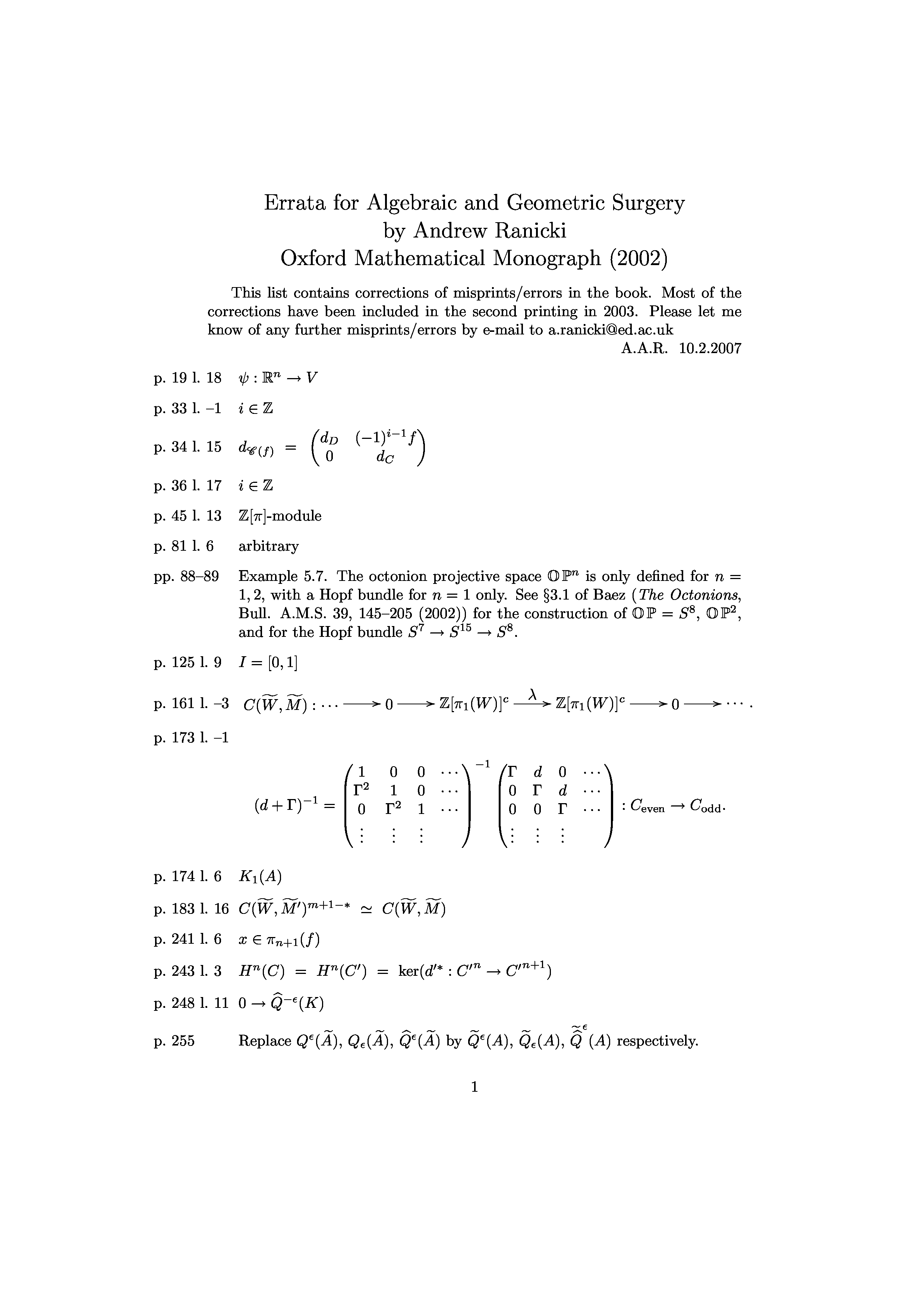 "Errata for Algebraic and Geometric Surgery" - читать интересную книгу автора (Ranicki A.)