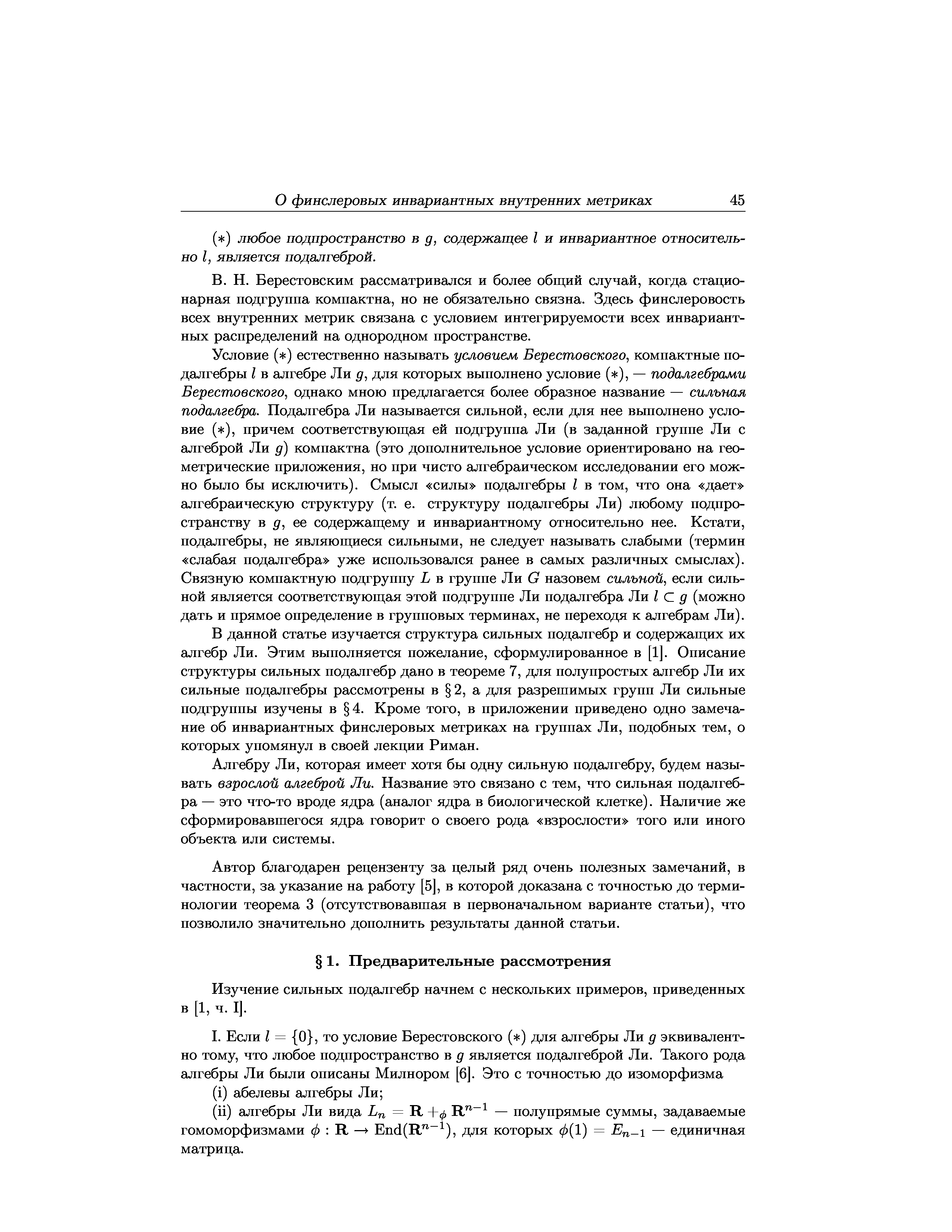 "О финслеровых инвариантных внутренних метриках на однородных пространствах и сильных подалгебрах в алгебрах Ли" - читать интересную книгу автора (Горбацевич В.В.)