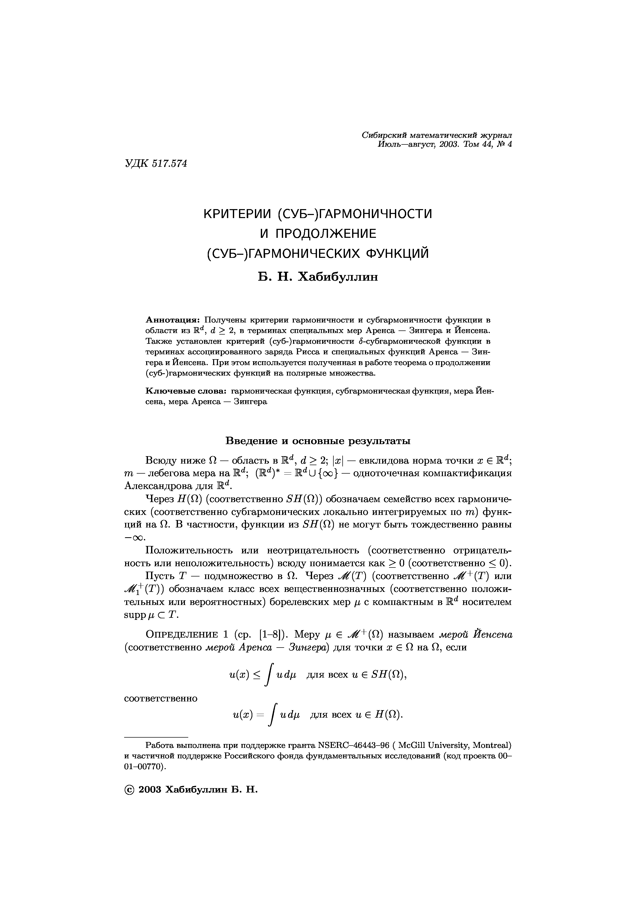 "Критерий (суб-)гармоничести и продолжение (суб-)гармонических функций" - читать интересную книгу автора (Хабибуллин Б. Н.) |