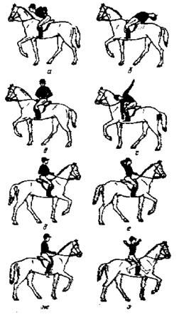 Рис. 26. Посадка всадника на шагу, рыси и полевом галопе. |