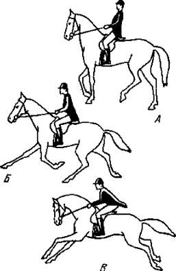 Рис. 25 Хорошо усвоив, что такое постановление, и научившись легко его добиваться, можно переходить к следующему аллюру — галопу. Галоп — аллюр в три темпа. Лошадь, оперевшись, например, в первый темп на левую заднюю ногу, ставит вторым темпом левую переднюю и правую заднюю ногу (левую диагональ), выходя третьим темпом на правую переднюю, и затем повторяет эти движения, разделенные моментом подвисания в воздухе между третьим и первым темпом, до тех пор, пока вы ее не переведете на рысь или шаг. Галоп, у которого третий темп попадает на правую переднюю, называется галопом с правой ноги, а галоп, у которого третий темп попадает на левую переднюю — галопом с левой ноги. Все выезженные лошади должны уметь подниматься а галоп и с левой и с правой ноги, а каждый всадник первого года обучения должен уметь заставить лошадь подняться с определенной ноги в галоп. При езде в манеже, по стенке, по команде «Галопом — ма-а-рш1» лошадь поднимают всегда с внутренней ноги, а именно: при езде налево — с левой, при езде направо — с правой. Если лошадь идет с наружной ноги, такой галоп называется контргалопом. Во время езды надо всегда внимательно как бы прислушиваться к движению лошади и своевременным посылом стараться предупредить неповиновение. Если лошадь пытается ускорить галоп — шенкель должен быть совершенно спокоен, а действие повода усиливается. Для всадника, умеющего хорошо сидеть на учебной и строевой рыси и могущего выполнять все вышеперечисленные упражнения, езда галопом не представляет никакой трудности. На рисунке 26 показаны способы посадки всадника: А — на всех сокращенных движениях — шаг, сокращенная рысь, сокращенный манежный галоп — стараться сохранять отвесное положение корпуса; равновесие по седалищу; Б — посадка при езде строевой рысью и в полевых условиях — равновесие по ступне; В — посадка для соревнований с прыжками и для кроссов — равновесие по ступне, корпус сильно подан вперед. Ни при каких случаях, кроме продолжительных спусков с горы, не следует подавать корпус назад. Скорости нормальных аллюров: шаг — 10 мин 1 км; рысь учебная — 7—8 мин 1 км; рысь строевая — 5 мин 1 км; рысь прибавленная — 3—4 мин 1 км; галоп манежный — 7—8 мин 1. км; галоп свободный — 3—4 мин 1 км; галоп полевой — 2—2,5 мин 1 км; карьер — галоп в полную возможность лошади (резвый галоп).