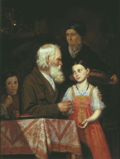 Другим, специально пасхальным развлечением, служит катание яиц и отчасти качели и игра в орлянку и карты. Катают яйца преимущественно ребятишки, да разве еще девушки, которые соскучились без хороводов и песен (на Пасху светские песни и хороводы считают неприличием и даже грехом). Зато на качелях катаются решительно все. Где-нибудь в конце деревенской улицы парни устраивают, так называемые, «обчественные» качели (в складчину) и возле этих качелей образуется нечто вроде деревенского клуба: девушки с подсолнухами, бабы с ребятишками, мужики и парни с гармониками и «тальянками» толпятся здесь с утра до ночи; одни только глядят да любуются на чужое веселье, другие веселятся сами. Первенствующую роль занимают здесь, разумеется, девушки, которые без устали катаются с парнями. Но так как толпа почти всегда приходит сюда изрядно подвыпивши, и так как качели раскачиваются не самими катающимися, а зрителями, то очень нередки случаи, когда от пьяного усердия доска с катающейся парочкой перелетает через перекладину и происходят несчастья — увечья и даже смерть. Что касается игры в орлянку и в карты, то обе эти забавы, с каждым годом, все более и более проникают в деревню и, под влиянием отхожих промыслов и трактирного просвещения, положительно становятся излюбленными играми не только молодежи, но и взрослых мужиков (об этом смотри подробности в главе «Святки»). Наконец, из числа пасхальных развлечений деревенского народа нельзя также не указать на обязательное приглашение в гости кумовьев и сватов. В этом отношении Пасха имеет много общего с масленицей, когда точно так же домохозяева считают долгом обмениваться визитами со сватами. Но на Пасху приглашают даже будущих сватов, т. е. родня обрученных жениха и невесты приглашает друг друга в гости, причем, как и на масленицу, во время обеда и всякой трапезы, жениха с невестой садят рядом в красном углу, поят их обоих водкой и, вообще, делают центром общего внимания. Обычай требует при этом, чтобы жених ухаживал за невестой, но так как ухаживание это носит, так сказать, ритуальный характер, то естественно, что в нем много натянутости и чего-то деланного, почти фальшивого: жених называет невесту обязательно на «вы», по имени-отчеству, или просто «нареченная моя невеста», сгребает руками сласти с тарелки и потчует ими девицу, а после обеда катается с нею по селу, причем опять-таки обычай требует, чтобы нареченные жених и невеста непременно катались обнявшись за талию: он ее, а она его. Как самый большой и наиболее чтимый христианский праздник, Пасха, естественно, группирует вокруг себя целый цикл народных примет, обычаев, суеверий и обрядов, неизвестных церкви, но пользующихся большой популярностью в темной среде деревенского люда. Общая характерная черта всех этих народных праздников есть все то же двоеверие, которым и доныне пропитаны религиозные понятия русского простолюдина: крестная сила хотя и побеждает нечистую силу, но и до сих пор эта побежденная и поверженная во прах темная сила держит в своей власти робкие умы и наводит панический ужас на робкие души. По мнению крестьян, в пасхальную ночь все черти бывают необычайно злы, так что, с заходом солнца, мужики и бабы боятся выходить на двор и на улицу: в каждой кошке, в каждой собаке и свинье они видят оборотня, черта, перекинувшегося в животное. Да