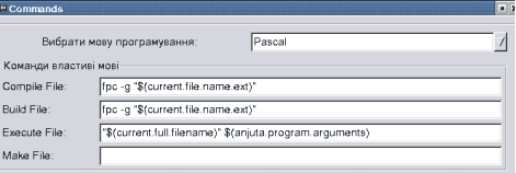 Для подключения компилятора FreePascal необходимо добавить в диалог "Команды" следующие установки: