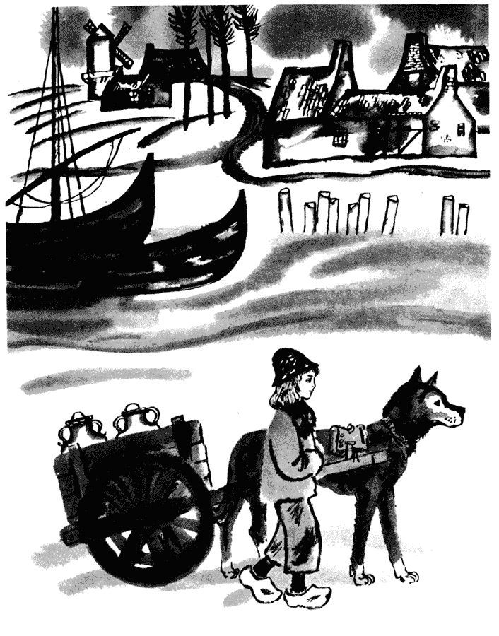 "Нелло и Патраш" - читать интересную книгу автора (Уйда)IIДа, летом им жилось очень хорошо. Фландрия не отличается красотой, особенно вблизи города Рубенса. Поля и луга следуют одно за другим на ровной местности, и однообразие ландшафта лишь изредка нарушает серый шпиль церкви или одинокая фигура человека, шагающего по полю со снопами или вязанкой хвороста на спине. Но земля здесь очень плодородная, и её обширные горизонты не лишены своеобразной прелести. В прибрежном камыше растут лилии, тополя тянутся ввысь, а по каналу, отсвечивая на солнце, плывут большие баржи с развевающимися разноцветными флагами. Окончив работу, Нелло и Патраш бродили по широкой зелёной равнине, а чаще всего, зарывшись в густой траве на берегу канала, смотрели, как проходят мимо неуклюжие суда, приносившие с собой солёный запах моря, который смешивался с ароматами деревенского лета. Зимою бывало куда хуже. Друзьям приходилось вставать затемно, в лютый холод, и порой им нечего было есть. В их лачуге, летом такой уютной и со всех сторон увитой диким виноградом, в зимние ночи было не теплее, чем в шалаше, а иногда в их лачугу протекала вода и потом замерзала. Ветер пробивался в щели ветхих стен, дикий виноград терял свои листья, голые поля кругом мрачно чернели. Да, зимой приходилось трудно. От холода у мальчика коченели руки и ноги, а неутомимый Патраш ранил себе лапы на обледенелых кочках. Но даже в зимнюю пору они не унывали. Обутый в деревянные башмаки мальчик и собака уверенно шагали по мёрзлым полям под звон бубенчиков на сбруе Патраша. Иногда на улицах Антверпена какая-нибудь женщина выносила им миску похлёбки или ломоть хлеба, а сердобольный торговец бросал несколько поленьев в маленькую тележку, возвращающуюся домой. Случалось, что какая-нибудь хозяйка из их деревушки позволяла им оставить себе немного молока, которое они везли на продажу, и тогда они бодро бежали ранним утром по запорошённой снегом дороге, а домой возвращались веселые и счастливые. В конце концов, им жилось не так уж плохо. А Патраш, встречая на дороге и на улицах города других собак, которые без отдыха трудятся с раннего утра до глубокой ночи и получают в награду пинки да ругань, считал себя счастливейшим на свете.