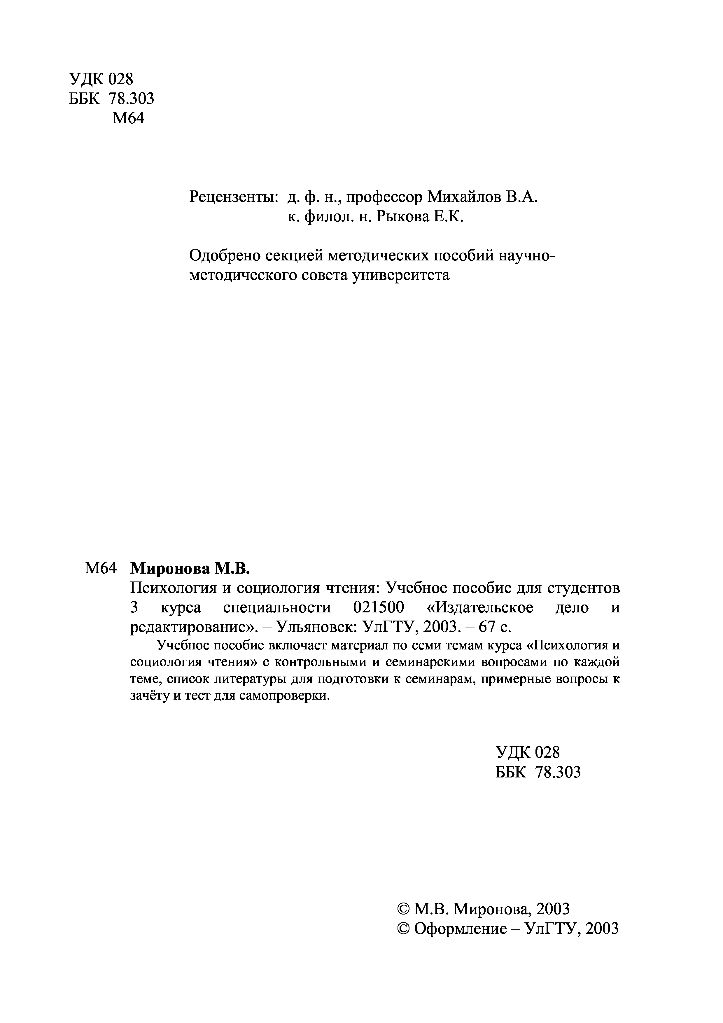 "Психология и социология чтения. Учебн. пособ для студентов 3 курса специальности 021500 Издательское дело и редактирование" - читать интересную книгу автора (Миронова М.В.) |