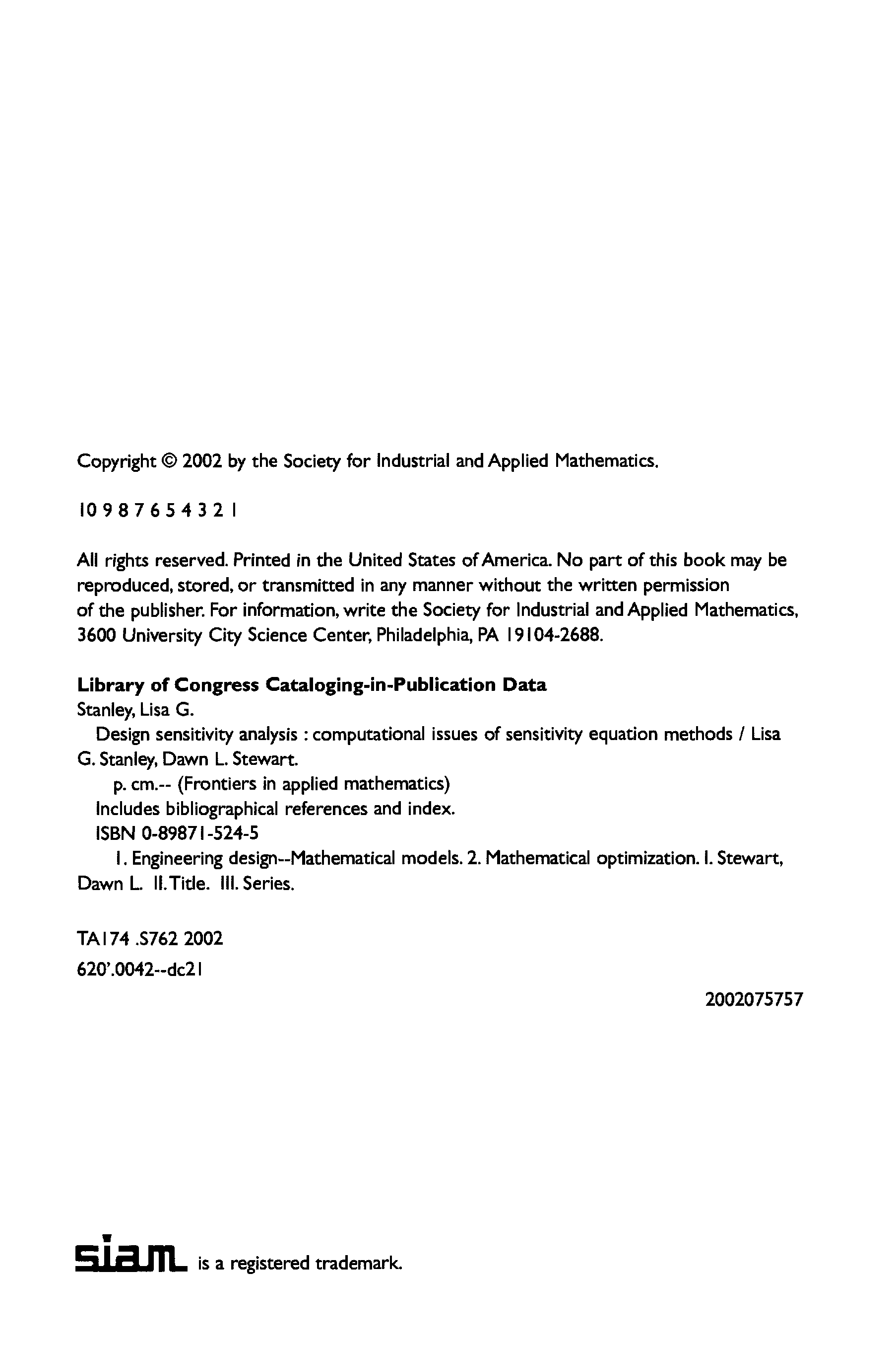 "Design sensitivity analysis: computational issues of sensitivity equation methods" - читать интересную книгу автора (Lisa Gayle Stanley, Davis Stewart) |