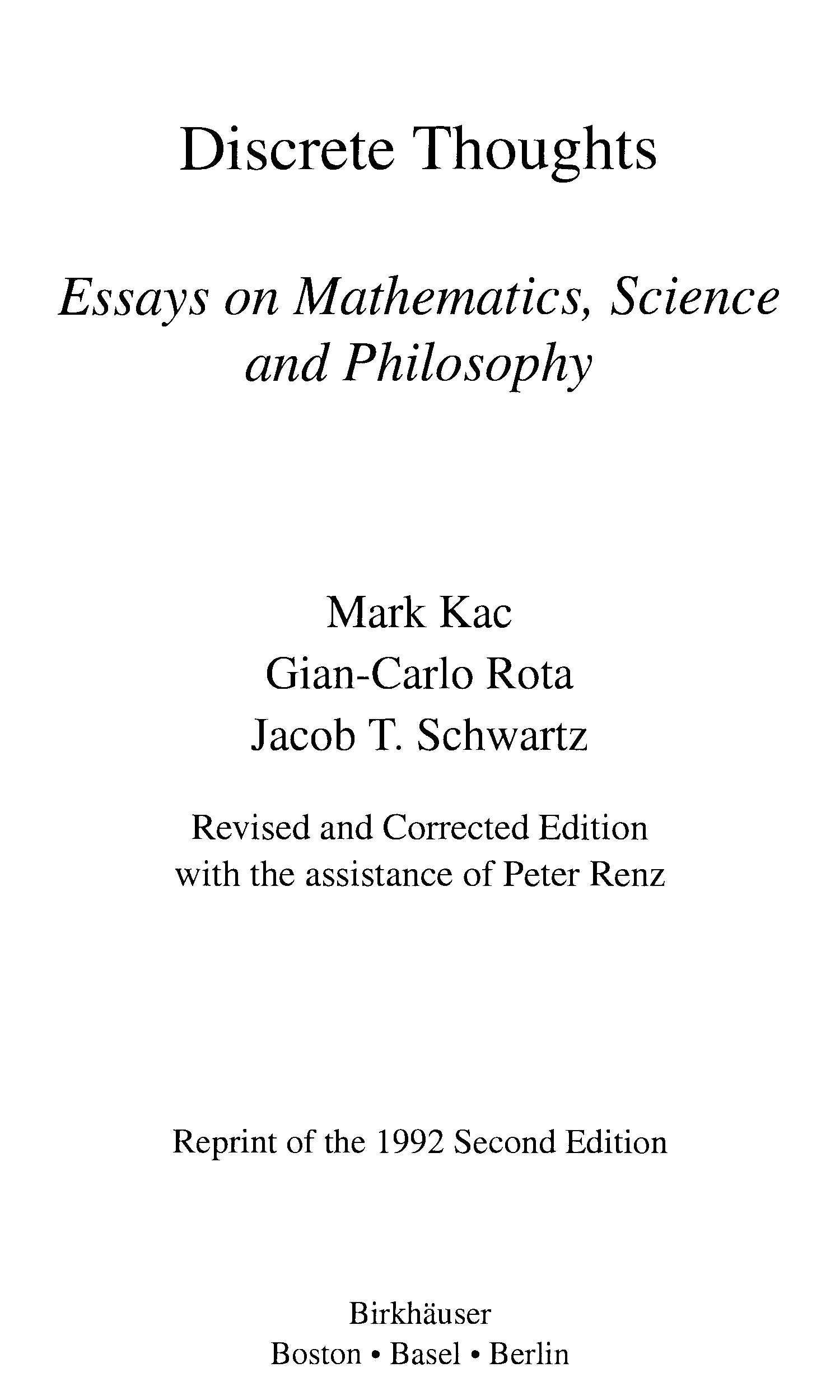 "Discrete thoughts: Essays on mathematics, science and philosophy" - читать интересную книгу автора (Mark Kac, Gian-Carlo Rota, Jacob Schwartz)