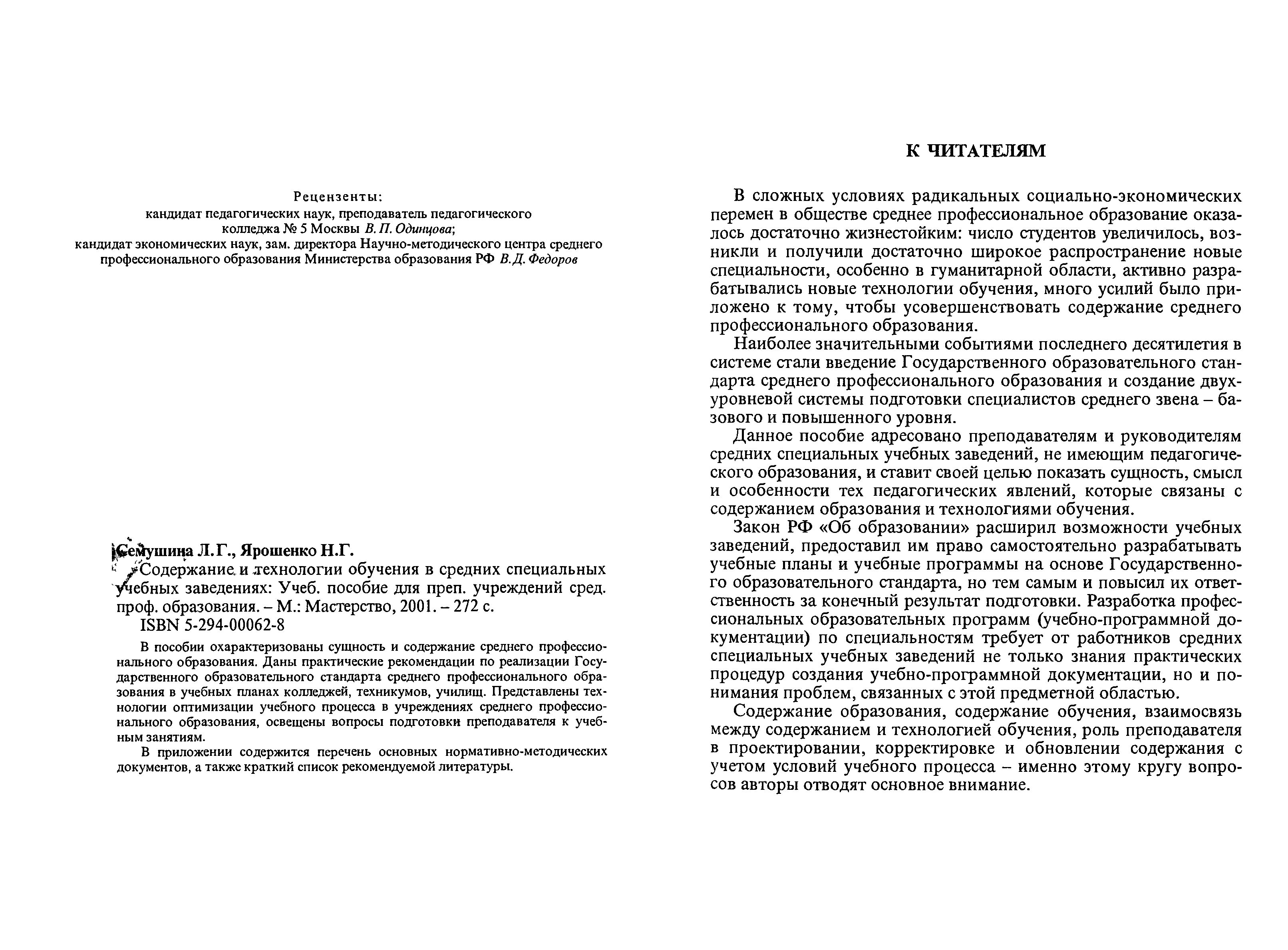 "Содержание и технологии обучения в средних специальных учебных заведениях" - читать интересную книгу автора (Семушина Л.Г., Ярошенко Н.Г.) |