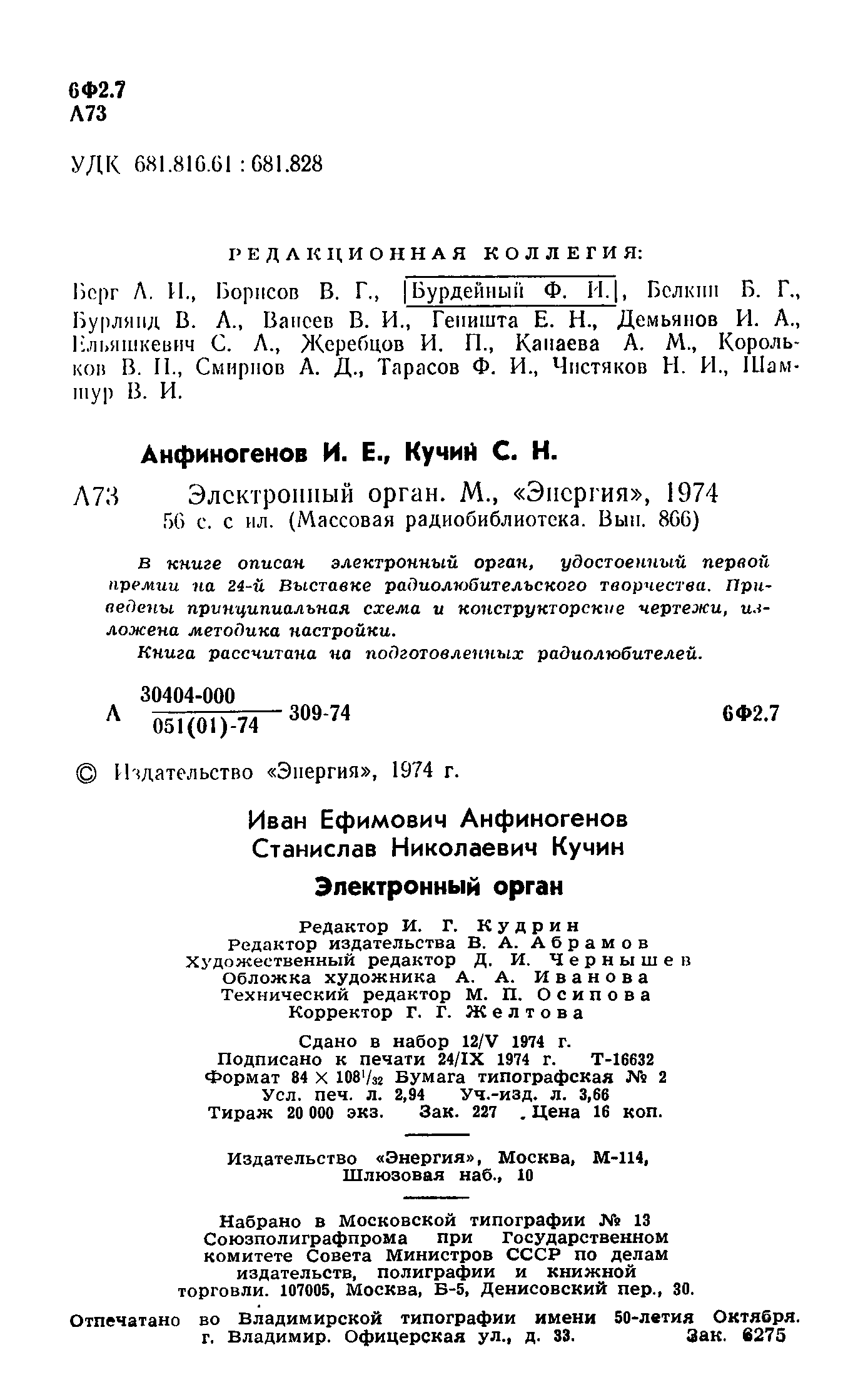 "Электронный орган (Массовая радиобиблиотека Выпуск 866)" - читать интересную книгу автора (И.Е. Анфиногенов. С.Н. Кучин.) |