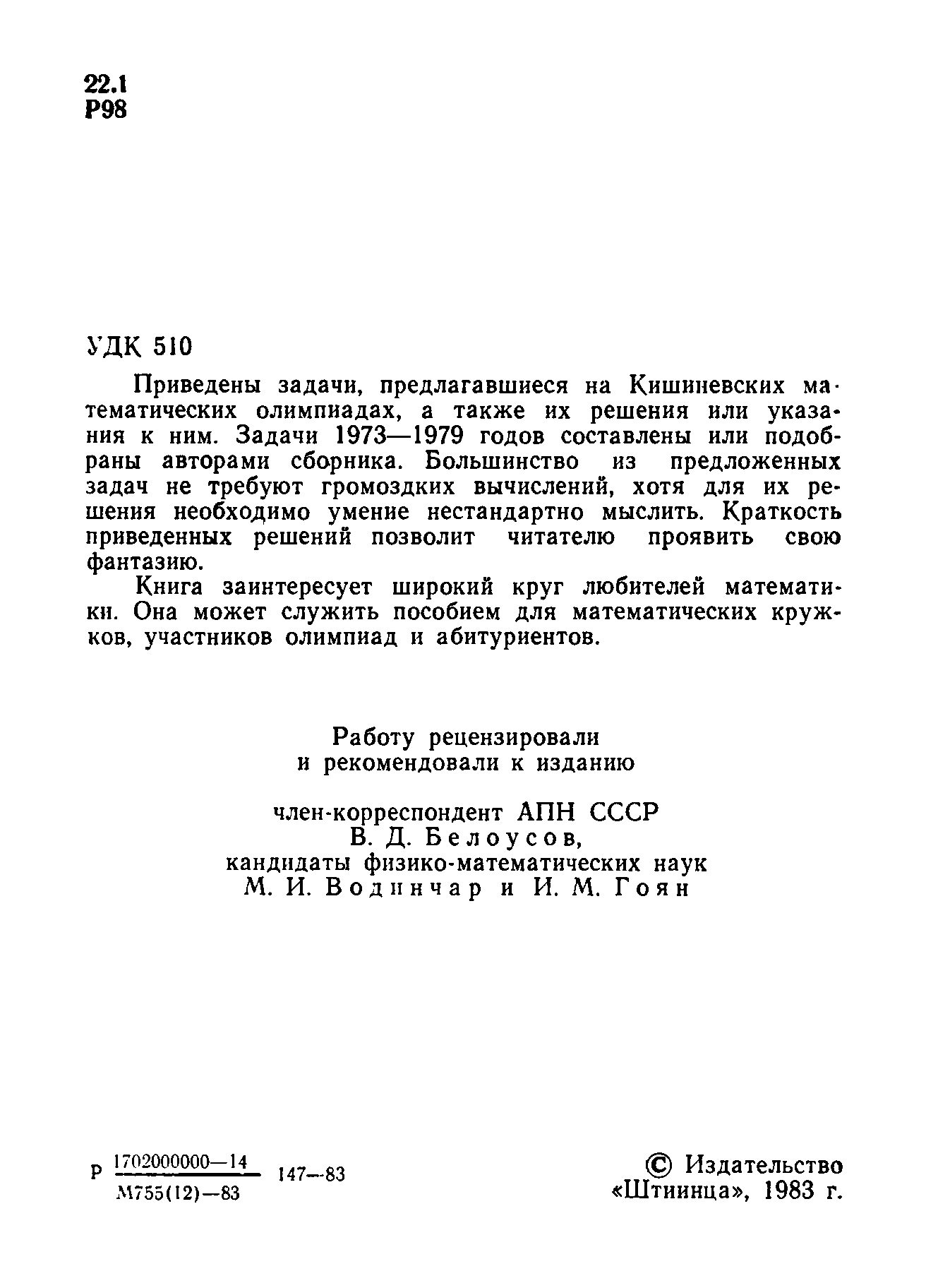 "Кишиневские математические олимпиады" - читать интересную книгу автора (Ю.М. Рябухин, В.П. Солтан, Б.И. Чиник) |