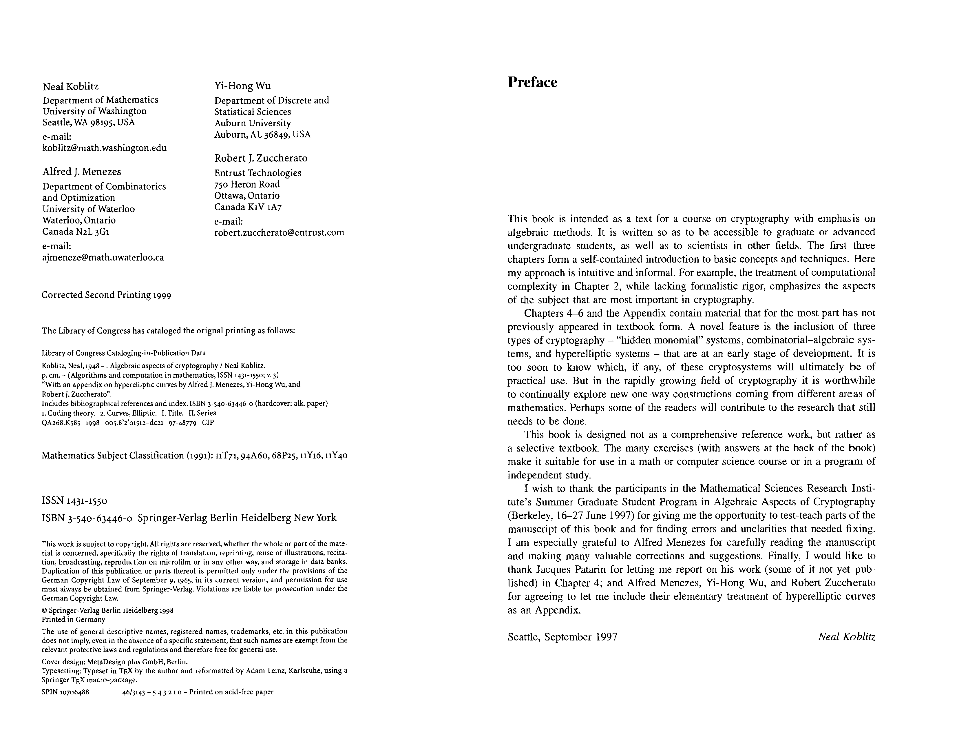 "Algebraic Aspects of Cryptography" - читать интересную книгу автора (Neal Koblitz, A.J. Menezes, Y.-H. Wu, R.J. Zuccherato)