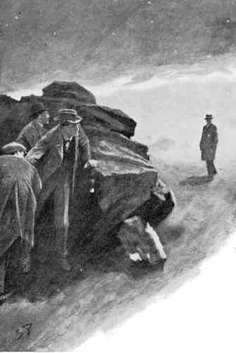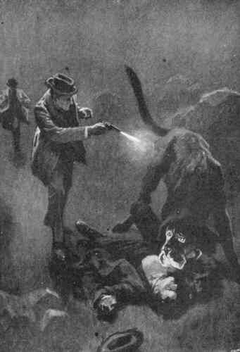 В тишине болот послышались быстрые шаги. Пригнувшись за валунами, мы напряженно всматривались в подступавшую к нам мутно-серебристую стену. Шаги все приближались, и вот из тумана, словно распахнув перед собой занавес, выступил тот, кого мы поджидали. Увидя над собой чистое звездное небо, он с удивлением осмотрелся по сторонам. Потом быстро зашагал по тропинке, прошел мимо нас и стал подниматься вверх по отлогому склону, начинавшемуся сразу за валунами. На ходу он то и дело оглядывался через плечо, видимо остерегаясь чего-то. — Тсс! — шепнул Холмс и щелкнул курком, — Смотрите! Вот она! В самой гуще подползающего к нам тумана послышался мерный, дробный топот. Белая стена была от нас уже ярдах в пятидесяти, и мы трое вперили в нее взгляд, не зная, какое чудовище появится оттуда. Стоя рядом с Холмсом, я мельком взглянул ему в лицо — бледное, взволнованное, с горящими при лунном свете глазами. И вдруг оно преобразилось: взгляд стал сосредоточен и суров, рот приоткрылся от изумления. В ту же секунду Лестрейд вскрикнул от ужаса и упал ничком на землю. Я выпрямился и, почти парализованный тем зрелищем, которое явилось моим глазам, потянулся ослабевшей рукой к револьверу. Да! Это была собака, огромная, черная как смоль. Но такой собаки еще никто из нас, смертных, не видывал. Из ее отверстой пасти вырывалось пламя, глаза метали искры, по» морде и загривку переливался мерцающий огонь. Ни в чьем воспаленном мозгу не могло бы возникнуть видение более страшное, более омерзительное, чем это адское существо, выскочившее на нас из тумана.