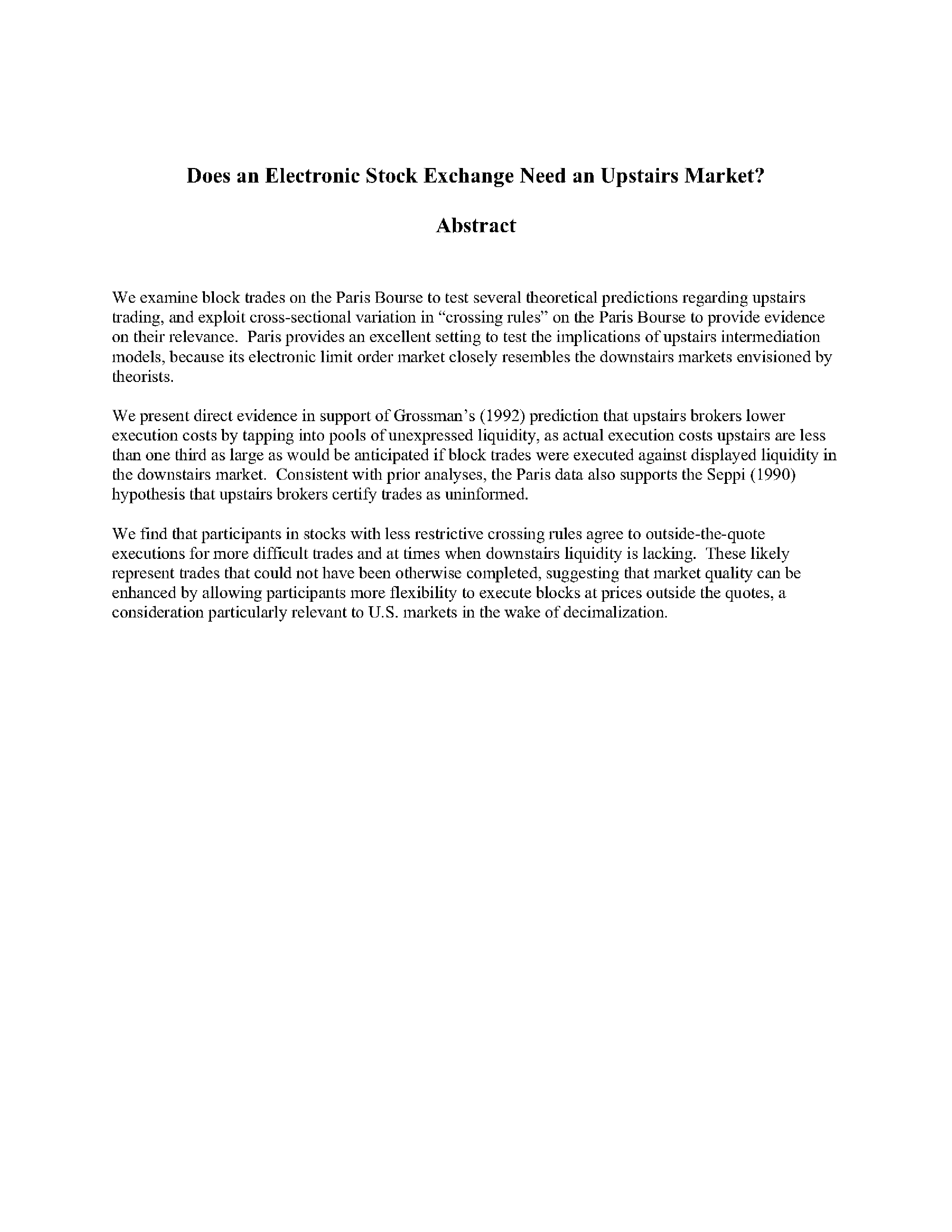 "Does An Electronic Stock Exchange Need An Upstairs Market" - читать интересную книгу автора (H. Bessembinder, K. Venkataraman) |