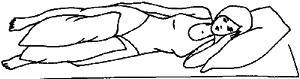 Поза № 2. Лягте на бок. Нижняя нога — в одной плоскости с туловищем. Верхнюю ногу согните в коленном и тазобедренном суставах. Под верхнюю ногу подложите 1–2 подушки. При этом меняется угол таза и поясничного отдела (рис. 23).