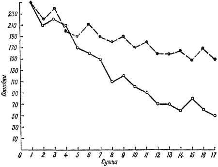 Эти интересные факты дают нам первую возможность понять, как проходит научение крысы. О каждом мышечном движении через определенные нервные пути передается обратный сигнал в мозг. Там возникает локализованное возбуждение. В зависимости от его степени животное в соответствии со своим прежним опытом либо делает поворот, либо бежит прямо. Таким образом, мы сталкиваемся здесь с так называемой кинестезией, или чувством движения, когда поведение управляется мышечными ощущениями. Кинестезия играет большую роль и в поведении людей. Тому, кто всегда кладет ручку на одно и то же место письменного стола, не обязательно смотреть, где она, когда ему нужно ее взять. Часто повторяемое движение управляется кинестетически. Следовательно, научение крысы в лабиринте заключается в том, что она вспоминает, что после затрат усилий Кинестезия является, таким образом, тем важнейшим средством ориентации, благодаря которому крыса научается находить в лабиринте правильный путь. Но это не единственное средство достижения цели. Как мы уже знаем, число ошибок снижается прежде всего вблизи цели; иначе говоря, животные научаются прохождению сначала конечных участков лабиринта, затем средних и, наконец, начальных. Значит, крыса каким-то образом замечает или чувствует приближение к месту, где лежит корм, или к выходу из лабиринта. Обоняние в данном случае не играет никакой роли, что легко доказать, убрав корм. Точно так же можно исключить какое-либо влияние зрения, обеспечив абсолютно равномерное освещение установки. Впрочем, слепые крысы так же хорошо научаются в лабиринте, как и зрячие. Весьма примечательно, что число ошибок хорошо обученной крысы после разворота лабиринта вновь возрастает. При однородном освещении не может быть и речи об ориентации по источнику света. Крыса, бегущая по лабиринту, с которым она хорошо знакома, должна каким-то образом знать или чувствовать, в каком направлении находится цель. Как или благодаря чему она это запоминает, по-прежнему остается неизвестным и загадочным. Исследование кинестетического научения, как и научения вообще, показывает его зависимость от двух психологических законов. Первый — это закон упражнения, который говорит о числе повторно достигнутых тождественных результатов. Чем больше проделано упражнений, тем выше результат научения. Результат зависит, кроме того, и от поощрения успеха. Крыса научается и тогда, когда не получает вознаграждения в конце своего пути, а просто изымается из лабиринта. Но конечный результат научения в дальнейшим не столь высок, как в случае, когда правильное поведение вознаграждается. Для пояснения мы приводим рис. 3, который не только дает представление о характере кривых научения, но и показывает разницу в поведении крыс, получавших и не получавших вознаграждения. Для сравнения были взяты две группы по 36 крыс; графически показано среднее число их ошибок. У невознаграждавшихся животных оно снизилось после 17 дней упражнений с 250 до 150, а у вознаграждавшихся — до 50. Сопоставление наглядно показывает значение закона поощрения успеха, второго весьма важного психологического закона научения.