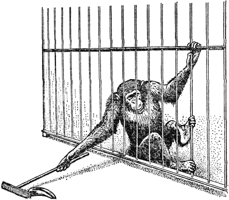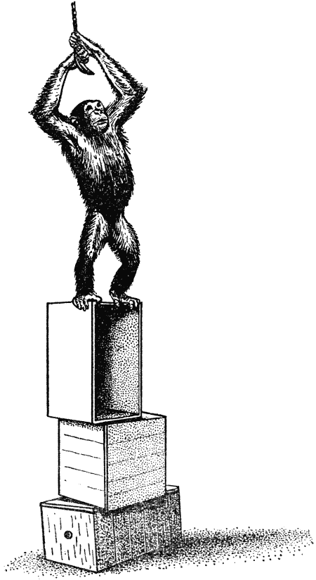 С тех пор этот эксперимент повторялся неоднократно, трудно сказать сколько раз, но во всяком случае немало. Чтобы облегчить шимпанзе выполнение этого задания, на конце одной из палок прикрепили поперечную дощечку — получилось нечто вроде граблей (рис. 36). Многочисленные новые наблюдения требуют сделать некоторые добавления к описанному мною опыту с палкой или граблями. Очень многие шимпанзе берут палку в руки не сразу после того, как появится приманка. Вначале они пытаются достать банан, яблоко или любое другое положенное для них лакомство просто рукой, высовывая ее через прутья решетки. После ряда безуспешных попыток дотянуться до приманки обезьяна как будто отвлекается: она бродит несколько минут взад-вперед по клетке в поисках другого занятия. Такое поведение обезьяны вызвало однажды у случайного зрителя восклицание: «Как она глупа!» Если бы он набрался терпения и постоял у клетки подольше, то увидел бы, как животное через некоторое время, весьма различное у разных особей, берет палку и, как бы нисколько не сомневаясь в успехе (в большинстве случаев удивительно ловко), подтаскивает заманчивый плод. Правда, бывает и так, что обезьяна не находит простого решения поставленной перед ней задачи. Не скрою, что иногда происходили и крайне прискорбные для экспериментаторов и весьма забавные для зрителей случаи. Один шимпанзе, за которым я наблюдал и которому никак не удавалось дотянуться рукой до лежащей перед его клеткой вишни, совершенно неожиданно стал бросать в меня песок и грязь. Замешательство обезьяны как будто перешло в ярость, в злость, в гнев. Но, быть может, в таком поведении обезьяны скрывается требование к человеку пододвинуть плоды поближе? По этому поводу нельзя сказать ничего определенного. Мы не должны забывать об одной очень реальной опасности — приписать обезьянам нечто большее, чем то, что неоспоримо демонстрируют их удивительные способности. Суть дела в том, что шимпанзе не всегда предвидит тщетность попыток достать лакомство непосредственно рукой. Как только уляжется разочарование, обезьяна начинает искать другие возможности и обращает внимание на палку или грабли. Стоит ей взять их в руки, как она тут же использует их в качестве орудия, чтобы пододвинуть приманку. При этом шимпанзе не проявляет никаких сомнений, не делает никаких предварительных проб. Здесь не может быть и речи об обучении методом проб и ошибок. Она как бы «читает с листа». Чем это объяснить? В чем шимпанзе превосходит собаку? Еще один, неоднократно проводившийся эксперимент помогает найти ответ на поставленный нами вопрос. Я имею в виду опыты с ящиками (рис. 37). В этом эксперименте к потолку клетки подвешивают банан на такой высоте, что испытуемый шимпанзе не может, подпрыгнув, достать его. В стороне стоят ящики (обычно в распоряжении обезьяны их несколько). Задача, поставленная перед животным, кажущаяся такой простой для человека, состоит в том, чтобы пододвинуть ящик под находящуюся на недосягаемой высоте приманку, взобраться на него и достать лакомство. Иногда для того, чтобы дотянуться до приманки, надо поставить друг на друга несколько ящиков.
