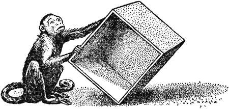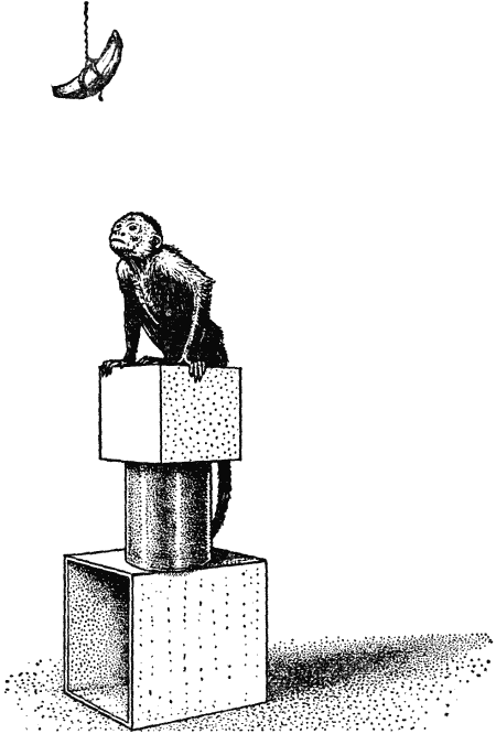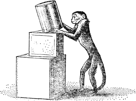 Начиная с этого опыта обезьяна вела себя в основном правильно. Она решила такую простую задачу. Это удалось ей, как мы видели, далеко не сразу, так что, строго говоря, ей нельзя приписать понимание обстановки. И все же предрасположенность к нему очевидна: маленькая обезьянка явно стремилась поставить ящик именно на выгодное место, и ей это не удавалось, видимо, только по «техническим причинам». Наиболее удобному способу перемещения ящика обезьяна должна была сперва научиться, а научившись, она правильно использовала свой опыт. При выполнении следующей задачи ящик стоял под плодом, который теперь был подвешен значительно выше, а рядом ставили еще один небольшой ящик; чтобы достать вишню, его нужно было установить на первый ящик. В шести опытах капуцин всего один раз действовал правильно. Никаких особых изменений в его поведении не показали и последующие эксперименты, Только во время двадцать девятого опыта обезьяна правильно и четко решила задачу. Она принесла маленький ящик, поставила ого на большой, влезла на него и взяла вишню.