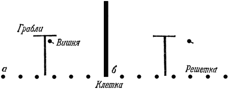 Исследование низших обезьян в экспериментах с палками или граблями показало, что они значительно уступают шимпанзе. Эксперимент с граблями, как правило, лишь тогда заканчивался успешно, когда плод лежал прямо перед поперечной планкой и его оставалось только подтянуть, как это показано на нашей схеме (рис. 42,
