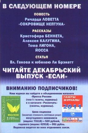 "«Если», 2010 № 11" - читать интересную книгу автора («Если» Журнал)PersonaliaАргентинский писатель, издатель, антологист, литературовед и активист всемирного фэн-движения Серхио Гаут вель Артман родился в 1947 году в Буэнос-Айресе. Изучал юриспруденцию в университете Буэнос-Айреса. В начале 70-х годов прошлого века написал несколько рассказов для испанского НФ-журнала «Nueva Dimension». В 1985 г. выпустил свой первый сборник рассказов «Тела как предметы желаний». В дальнейшем опубликовал еще две книги — «Настоящее мясо» (2006) и «Убегающие зеркала» (2009), а также свыше 30 рассказов в различных журналах и сборниках НФ и шесть объемных эссе исторического и литературоведческого плана, самыми яркими из которых являются «Вселенная научной фантастики» (2006) и «Тайные общества в истории Аргентины» (2010). Выступил составителем сборников и антологий фантастики (всего подготовил девять изданий). Его собственные произведения переводились на восемь языков, включая болгарский, японский и арабский. Является обладателем ряда жанровых премий стран Латинской Америки и Испании. Писатель активно участвовал в развитии аргентинских и других испаноязычных печатных изданий, посвященных фантастике. В течение трех с лишним лет являлся литературным директором знаменитого аргентинского электронного журнала «Axxon». В начале 2000-х годов Артман основал в Сети испаноязычное сообщество писателей, переводчиков и любителей фантастики «Comunidad SF», а также «Taller-7» и «Taller-8» — виртуальные «школы креативного письма» для начинающих авторов, координатором которых является по сей день. Сейчас «Comunidad SF» расширилось до международного и многоязычного WEB-форума «Planeta SF». Американский писатель и профессиональный музыкант Раджнар Ваджра родился в 1947 году в Нью-Йорке. До занятий литературой был «классическим» пианистом и занимался рок-музыкой (играл на гитаре и клавишных), писал песни, преподавал в университете и был владельцем музыкального магазина. Ваджра дебютировал в научной фантастике рассказом «Прохождение теста Арболи» (1997). С тех пор опубликовал два десятка рассказов и повестей, выпустил книгу в межавторской серии «Нулевая вероятность» — «Последовательности» (2000), а также роман «Выступ у Нокай Коррал» (2003). Большинство произведений писателя вышли в журнале «Analog», и дважды фантаст становился победителем конкурса на лучшее произведение, опубликованное в данном журнале. Московский фантаст, поэт и литературный критик Николай Калиниченко родился в 1980 году в Москве. Закончил школу № 59 им. Н.В.Гоголя — ту самую, в которой учился Кир Булычёв; высшее образование получил в МАДИ по специальности «Мосты и транспортные тоннели». Строил дома, проектировал мосты, работал продюсером, художником-оформителем, участвовал в археологических раскопках. Фантастикой увлекся еще в школе. Первая публикация появилась в 2003 году — это был НФ-рассказ «Воры в банке» (в соавт. с Дмитрием Хомаком). С тех пор опубликовал десяток рассказов в центральной периодике и в сборниках. А с 2006 года активно выступает в качестве литературного критика, его статьи и рецензии регулярно публикуются в журналах «Если», «Мир фантастики», еженедельнике «Ex Libris НГ». В недавнем интервью сетевому ресурсу FearZone американский писатель-фантаст, чьи произведения номинировались на премии «Хьюго», «Небьюла» и Премию имени Брэма Стокера, расск