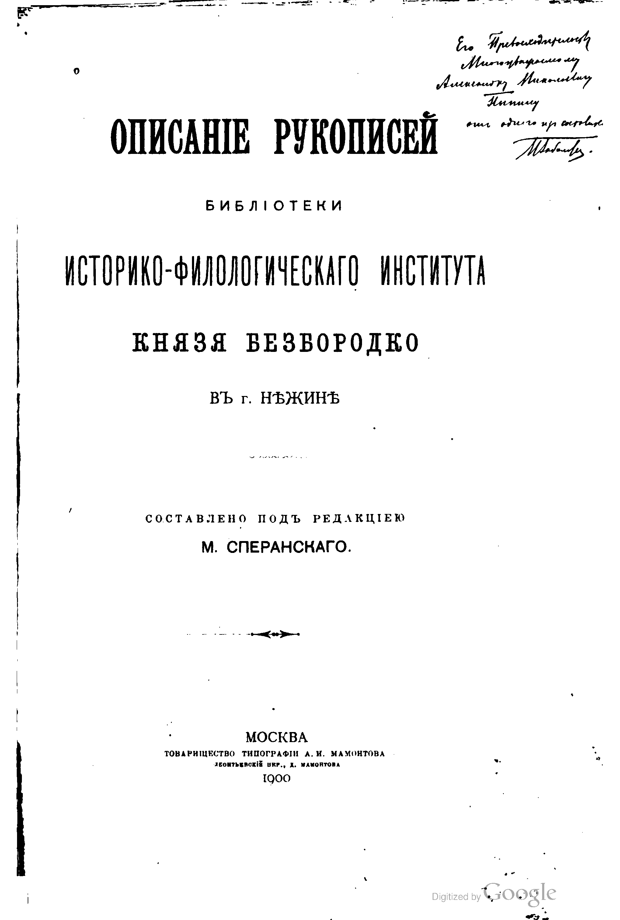 "Опись рукописей библиотеки ист-фил ин-та князя Безбородко в г. Нежине" - читать интересную книгу автора (Сперанский М.)