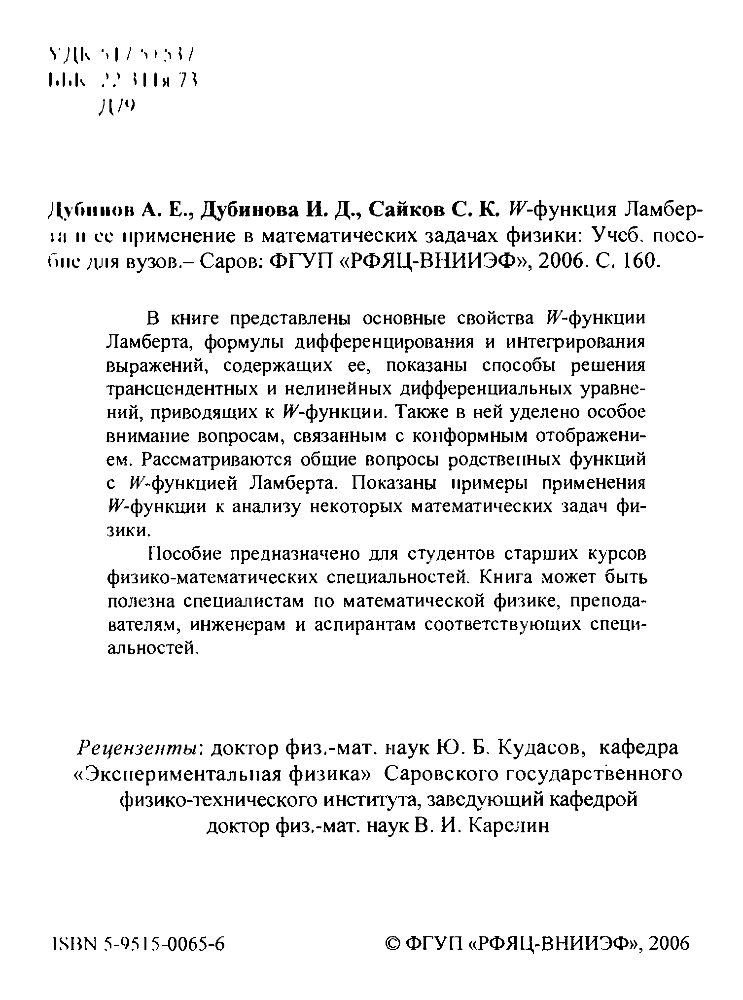 "W-функция Ламберта и ее применение в математических задачах физики" - читать интересную книгу автора (Дубинов А.Е., Дубинова И.Д., Сайков С.К.) |