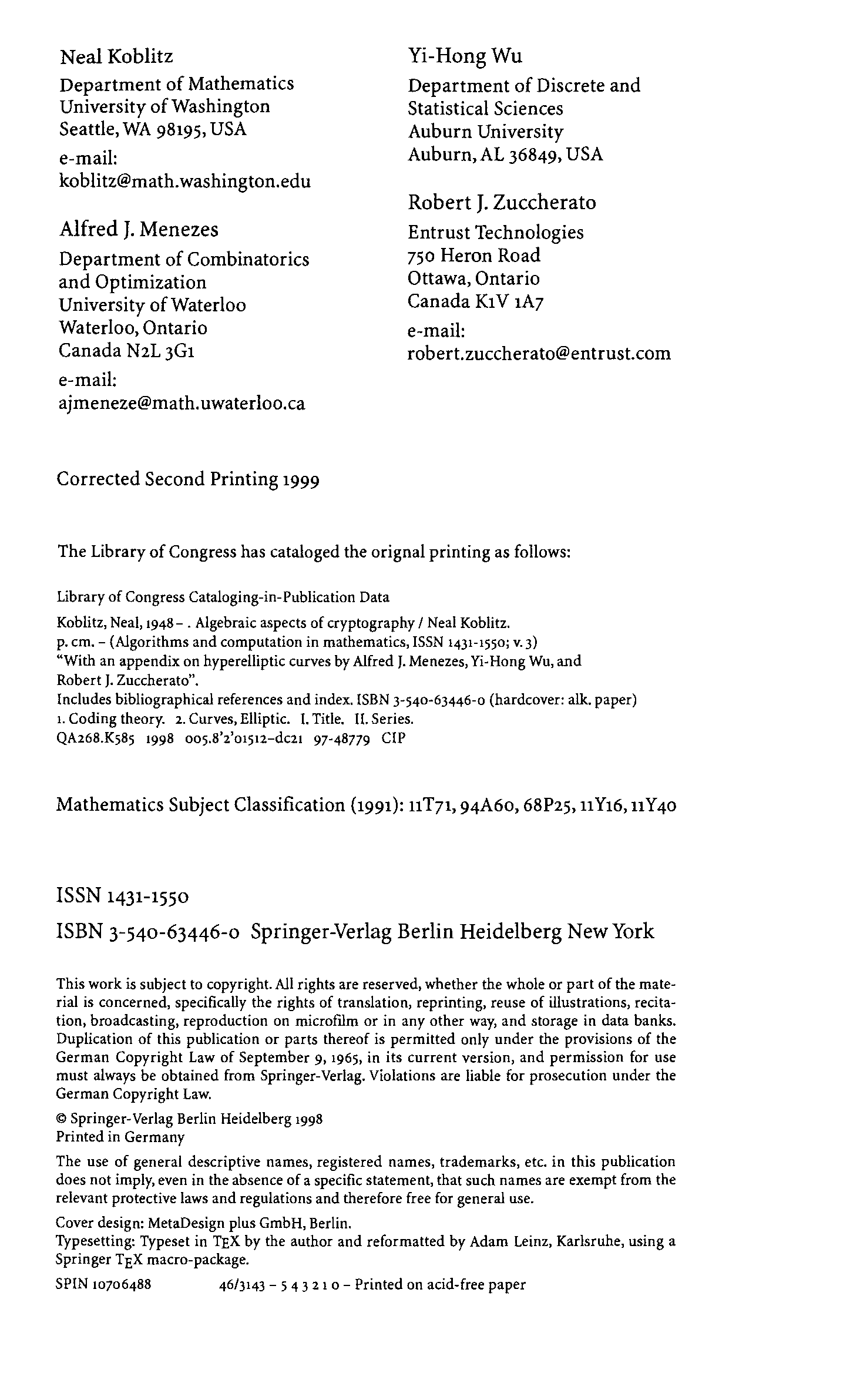 "Algebraic aspects of cryptography" - читать интересную книгу автора (Neal Koblitz, A.J. Menezes, Y.-H. Wu, R.J. Zuccherato)