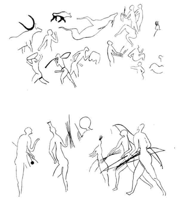 Я уже много лет занимался исследованием Сахары и исколесил ее вдоль и поперек, изучая пустыню с географической, этнографической, а главное, с археологической точки зрения. Естественно, я не мог остаться равнодушным к обнаруженным здесь петроглифам и наскальной живописи. Поэтому, как только стало известно о замечательных открытиях в Тассили лейтенанта Вренана, я тотчас же в сопровождении нескольких специалистов по Сахаре (географов и археологов) примчался в те места. Однако начавшаяся война прервала мою работу. Только в 1956 году при поддержке моего глубокоуважаемого учителя Брейля я смог организовать экспедицию в Сахару. Ее целью было снять копии с уже известных росписей и попутно систематически обследовать весь горный массив. Массив Тассилин-Аджер лежит к северо-востоку от Ахаггара и примыкает своим восточным краем к Феццану. Это труднодоступное песчаниковое плато, от которого отходит ряд небольших второстепенных массивов. Все они подверглись сильному действию эрозии. Пробираться здесь можно лишь узкими ущельями или по поверхности, усеянной колоннообразными выветренными скалами и вызывающей в памяти картину мертвых городов. Сейчас эти массивы — совершенно глухое место, где царит гнетущее безмолвие. Но когда-то все эти ущелья и проходы представляли собой своего рода улицы с многочисленными обитателями. Об этом свидетельствуют глубокие впадины у подножия скал, служившие естественным убежищем для первобытных жителей массива. Обитатели исчезли. Но следы их пребывания остались в виде сотен и сотен росписей. Мои сотрудники и я пробыли безотлучно шестнадцать месяцев на плато. Каждый день приносил нам новые открытия. Обследуя одно место за другим, мы тщательно наносили на кальку все обнаруженные наскальные росписи. Ниже я опишу, как велась работа в этой каменной пустыне. Опишу край, лишенный каких-либо признаков жизни, невыносимые климатические условия. Нам пришлось, должен признаться, весьма туго. Мы никогда бы не выдержали, если бы не сознавали, что наша работа не только даст многое для изучения прошлого Сахары, но и обогатит сокровищницу художественных ценностей, созданных человечеством. То, что мы нашли в лабиринте скал Тассили, превосходит всякое воображение. Мы открыли сотни и сотни росписей с десятками тысяч изображений людей и животных. Одни рисунки располагались изолированно, другие представляли собой сложнейшие композиции. Изображенные на них сцены жизни древних обитателей этих мест — будничные занятия, развлечения, религиозные обряды — нетрудно истолковать. Они, несомненно, относятся к жизни различных народов, населявших массив в разное, но, бесспорно, давно прошедшее время, ибо современные туареги очень редко появляются в этих диких, неприветливых местах. Нас поразило разнообразие стилей и сюжетов, которое мы обнаружили при исследовании многочисленных наслоений росписей. Рядом с крошечными фигурками людей находились и изображения такой гигантской величины, какой никогда нигде еще не встречалось. На других росписях мы увидели лучников, сражающихся за обладание стадом быков, воинов, бьющихся на палицах. Тут же — стадо антилоп, люди в пирогах, преследующие бегемотов, сцены плясок, пиршеств и т. п. Короче говоря, мы очутились как бы в величайшем музее доисторического искусства. Некоторые рисунки поражал